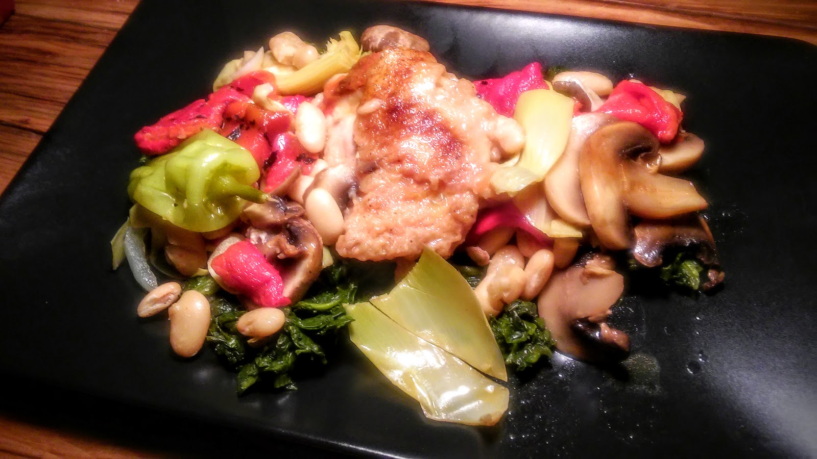 I'm calling this Antipasto Chicken. Braised chicken with green olives, artichoke hearts, red peppers, pepperoncini peppers and white beans. A little chicken stock with lemon. The pickled flavors penetrate the beans and brighten the sauce.