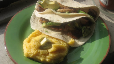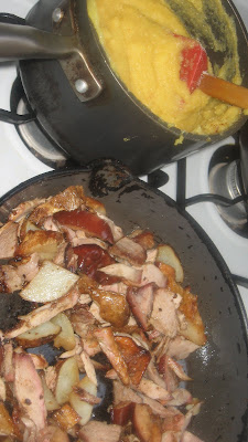 Found a tiny piece of pork shoulder on sale so instead of doing the major slow roasted pulled pork, I baked it just until tender but slice-able. Alongside I roasted potatoes and Red Delicious apples. In warm flour tortillas with avocado, the salted chunks of meat, apple and potato were very consoling. Then a velvety corn meal mash with butter gave the whole plate a calm reassurance.
