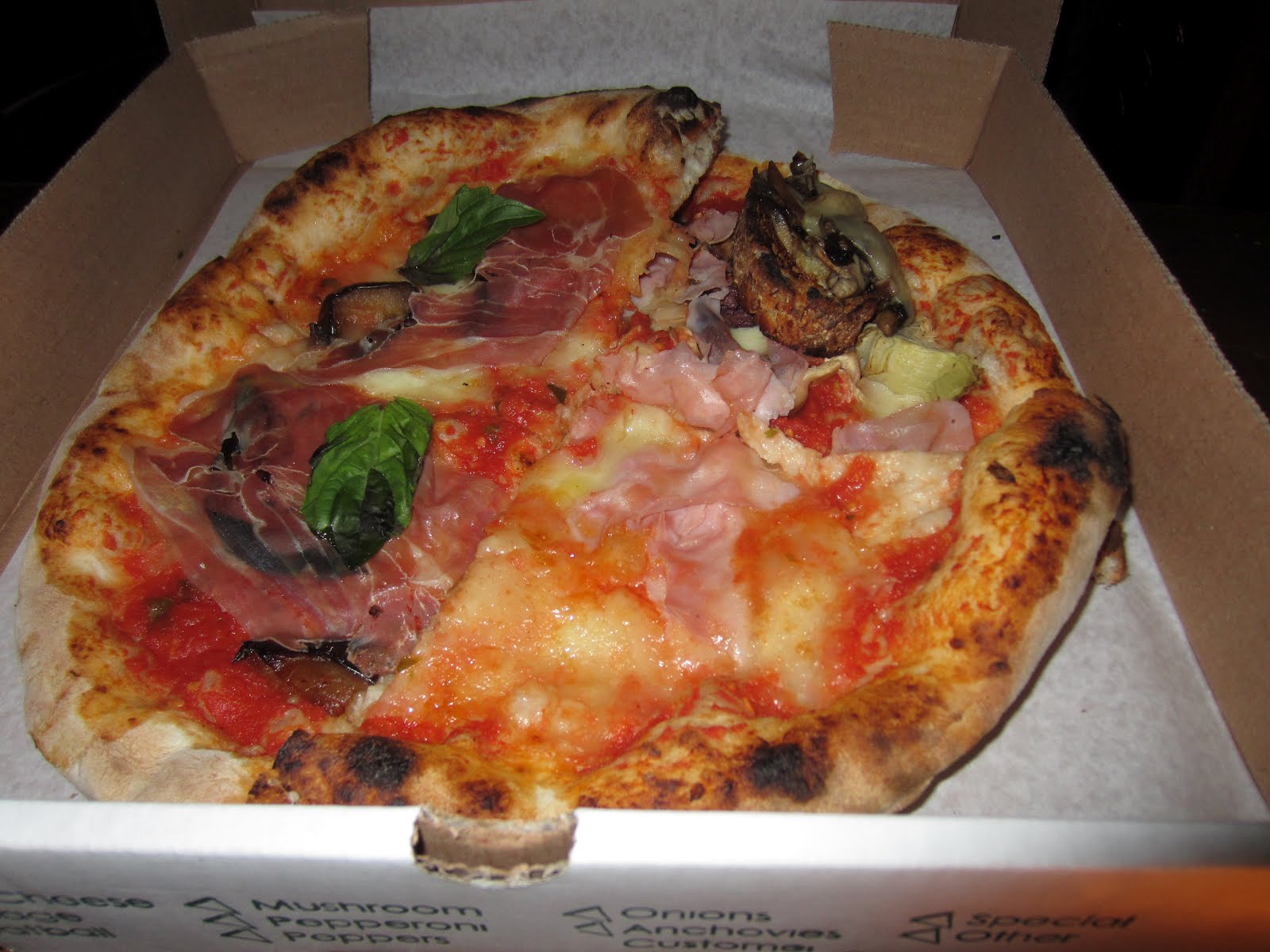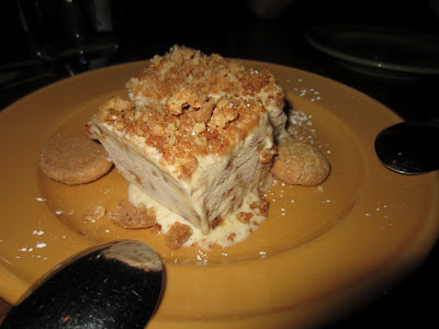 We had three pizza's, the Quattro Stagioni - tomato sauce, mozzarella, artichokes, black olives, ham, mushrooms,the Paesana - tomato sauce, mozzarella, sausage scallions, black olives and roasted peppers and the Krotone-tomato sauce, hot soppressata, spinach, mushrooms, onion and mozzarella. These were great! But the real stars that night for me was the appetizer, the Mushroom And Fontina Cheese Bruschette. And the dessert which I can't remember the names now but the white one was one of those roll-your-eyes-back-its-so-good type desserts. I blacked out a second during the conversation falling completely in love with this cream, dreamy combo. The little cookies on the side MUST have been made from the gods. A fitting Bon Voyage for M.