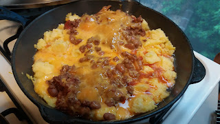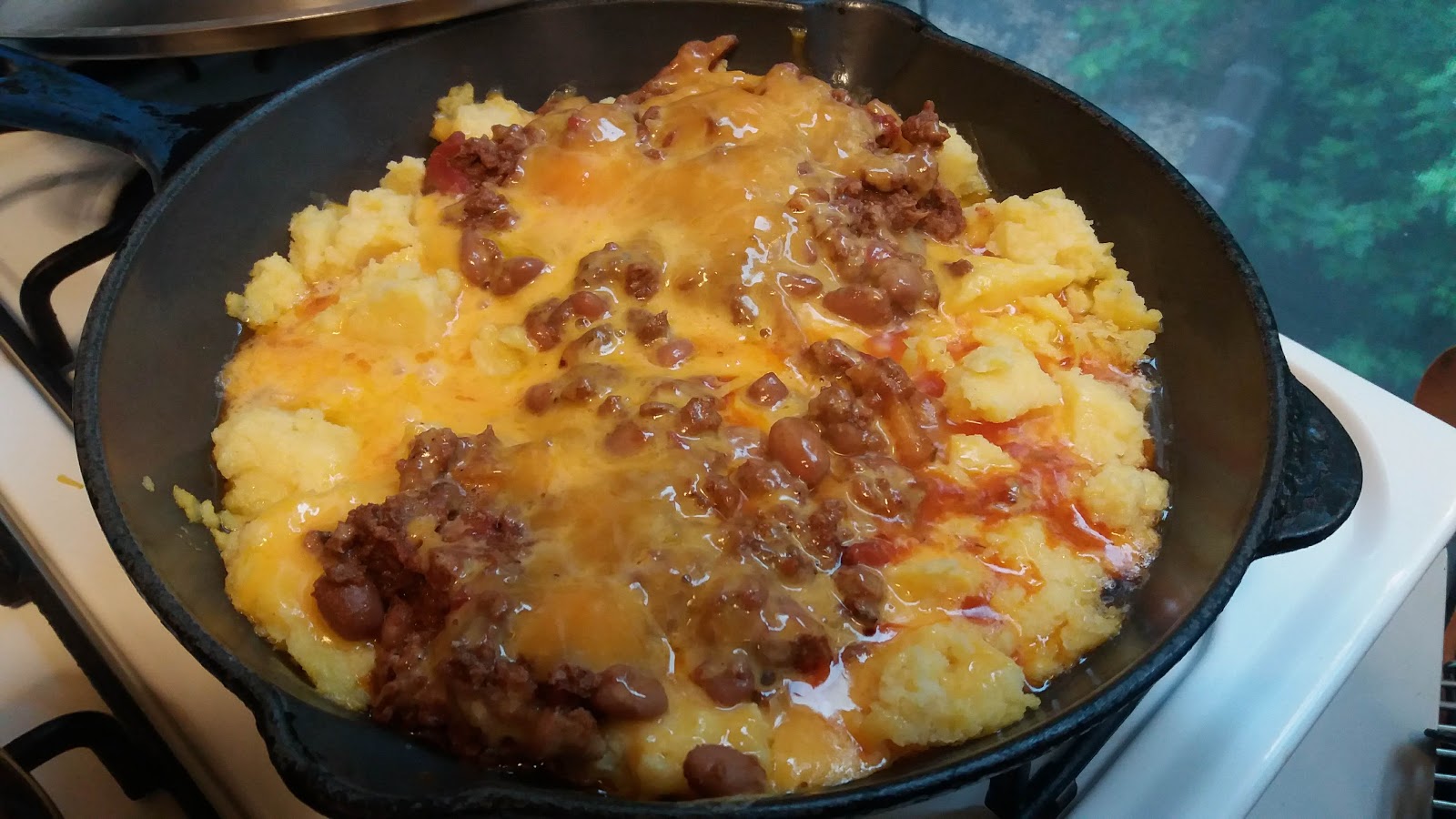 I produced two fun meals out of one small chili batch.  Firstly a corn meal spicy tamale type skillet with melted Cheddar cheese over the chili.  Then adding cool, crisp iceberg lettuce and onion to the top.