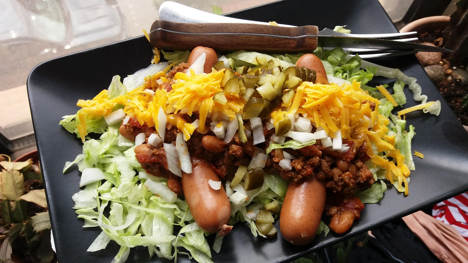 Then later, took that same leftover chili and lettuce head and built a cool bed for bunless chili hot dogs with pickles, cheese and onions.