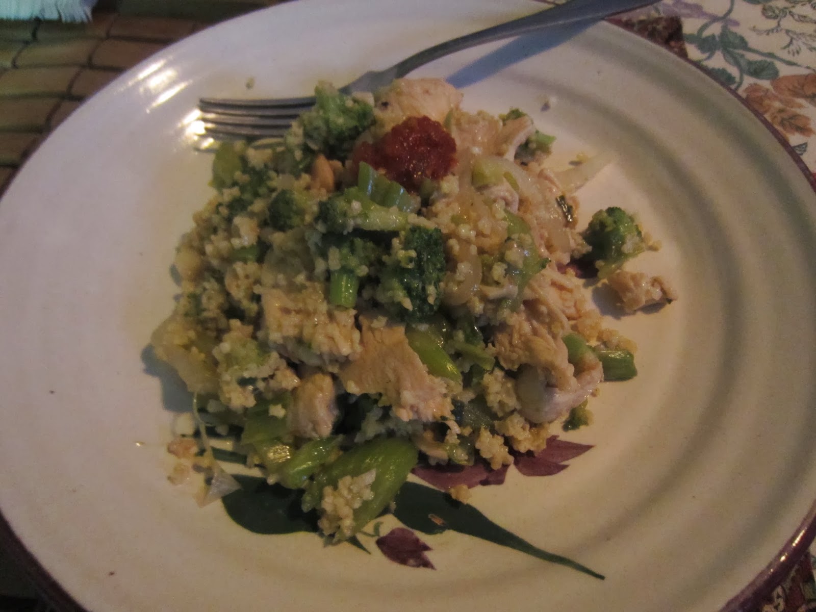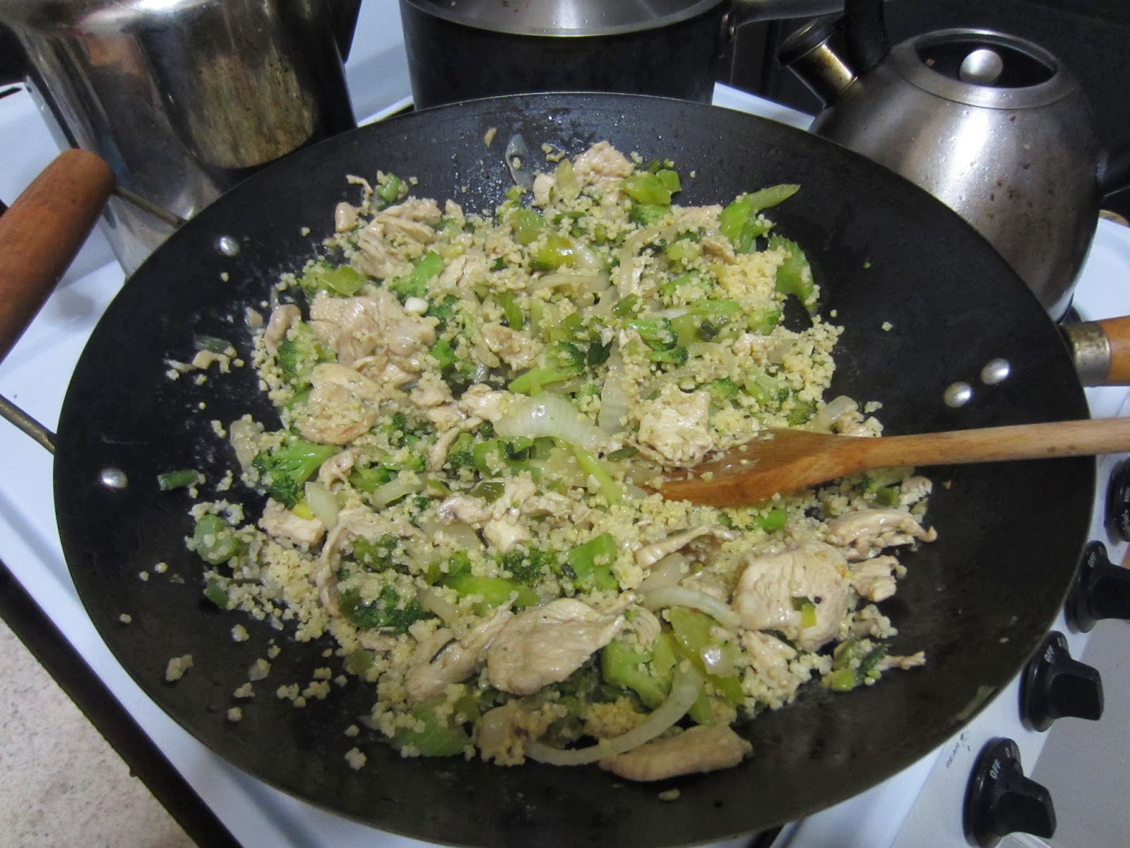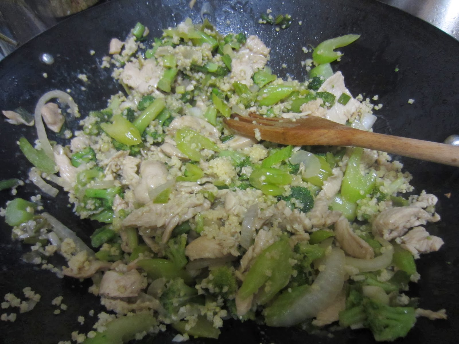 So I high-heat wok cook my onions and celery, then I add my thin cut chicken breast that has quickly marinated in a little soy, corn starch and chicken stock along with white pepper and lots of garlic. Then I add my thawed brocolli. To mock rice, I used my new weapon...millet. An ancient African grain that dates back 3500 BC. But mostly I tried it because it was one of the cheapest of the expensive whole grains packaged by Bob's Red Mill. I went to buy Quinoa again and it had jumped to $15 bucks. This looks like it but it actually tastes more corny and denser. I liked it. Reading up a bit, sounds like it may not be as life changing as quinoa but it was great in this dish and I aim to use it regularly. It's gluten free if it matters. It's high in protein, fiber and B vitamins. Sold!