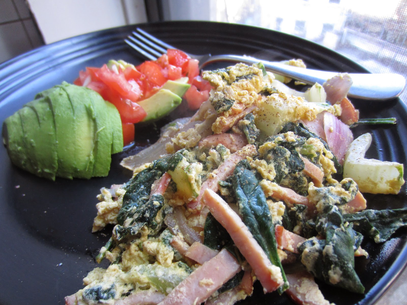 Leftover breakfast scramble. Egg White & Canadian bacon scramble with all the leftover vegetables that I had from the week like bok choy, swiss chard, green onion, red onion, and mushrooms. I'm so cheap. And I like really easy simple things.