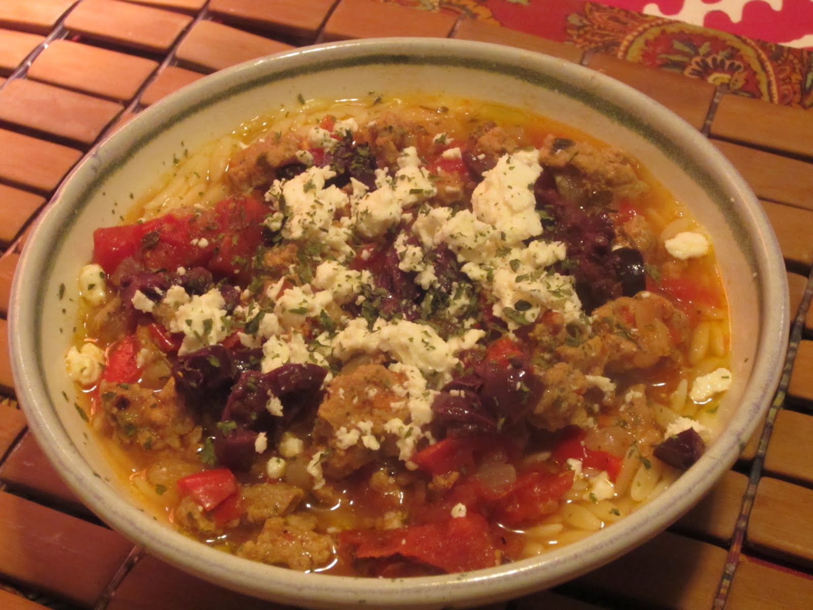 This was born out of my fascination with ground turkey meat and weakness for pasta. I was searching for a quick but easy dinner and ready to just give up and make a huge bowl of spaghetti with meat sauce. Almost a mistake I whipped up an interesting take on Greek pasta using orzo, ground turkey, feta cheese, kalamata olives, tomatoes, oregano, a little cinnamon, garlic and parsley.