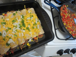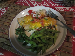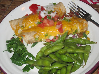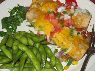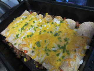 Mass amounts of beans and rice with grey tasteless beef chunks filled the torpedo along with not enough salsa, guacamole and sour cream. It ended up being like the prize inside the cereal box that you'd look forward to hitting. After that, just more mushy heavy nothingness in the endless sheet of a tortilla. I like small burritos with limited fillings. This time I just took all my delicious ready made 'Goop' (see previous post) filling and wrapped up a small whole wheat flour tortilla. I topped with shredded cheese (none inside to save some calories) and melted in oven, fresh onions, tomatoes and 'penos on top. Get a little crisp on that tort, enough to make the outside a little hard but the inside stays nice and moist. I'm also a no beans or rice in my burrito kinda gal with one exception, if it's a bean and cheese burrito of which I am a major fan. I'm old fashioned in that I feel the place for those two side are just that, on the side of the plate. You can play with each bite to see how much rice you want in your beans, vise versa, etc, etc. They pre-mixed them together which also made the burrito usually fall apart or split out of heaviness or being too moist. And then the thick end piece that if you got to it, meant you had about 5 lbs of this crap and probably could stand to lose that mangled mound that itself unraveled to about the size of a regular tort. A whale of a meal.