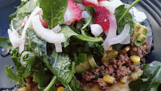 I layered the corn, the meat, avocado, dressed greens, sweet onions and sliced strawberries, like that dip but it ate more like a meal. If this salad were on Chopped (Amature addition of course), for the entree, I may have slid into the dessert round. I didn't transform the ingredients but they all really played so well together in my mouth. And I think R would like this salad if I made it for her.