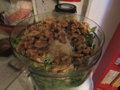 Then I lightly sauteed the garlic for the pesto to concentrate the oil and also to give it a mellower tone. Lots of toasted walnuts and grated Parmesan cheese went in as well.