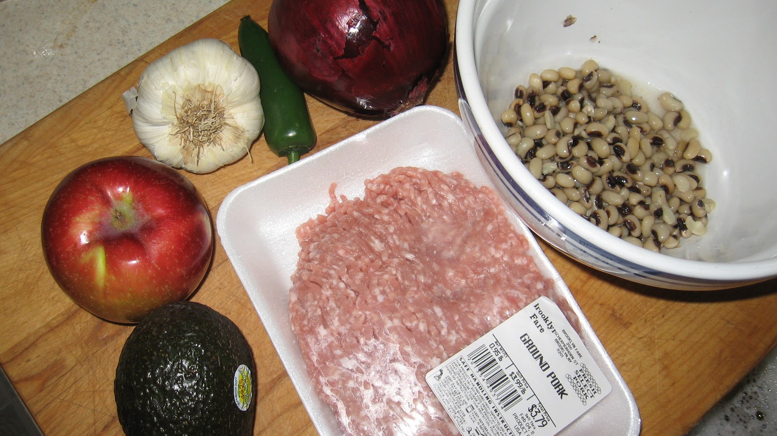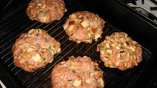My own little personal economic downturn has postponed food projects this week. The ice storm that cometh cameth and wenteth and now its time for some turkey burgers. I did a mini brainstorm today on my 15 minute break and decided I could do a way cool cranberry turkey burger since I really like the taste of cranberries and they're good for you and its a good taste together right? We know this from Tday. But *they were out of cranberries so I decided to do a macintosh apple instead with some red onions, some leftover black eyed peas, garlic and a nice bright jalapeno. Ground turkey was 6.99 for a little pack, so I got the ground pork. This is almost a veggie burger, the ground pork is just there to support the beans, apples and onions. No cheese on these, and I will be serving them open faced.