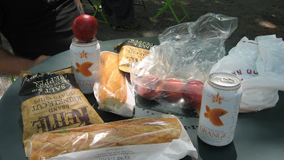 We rode to the George Washington Bridge on the West Side and then on the way back had lunch in Union Square Park. Sandwiches from Pret. Very tasty. Arugula, shaved Parmesan cheese, roast beef on a crusty baguette. Chips and the best orange sparkling soda.