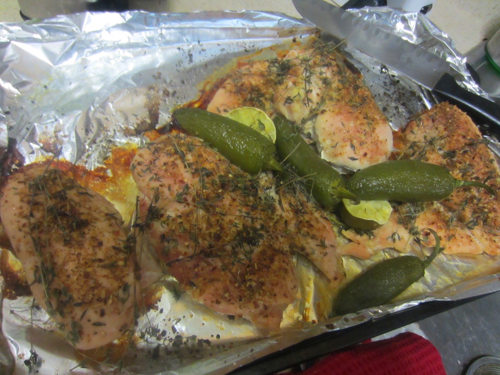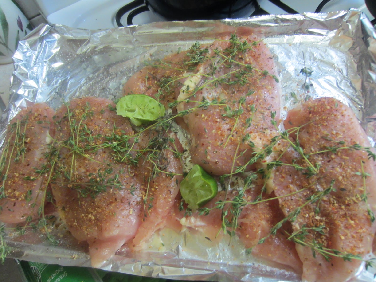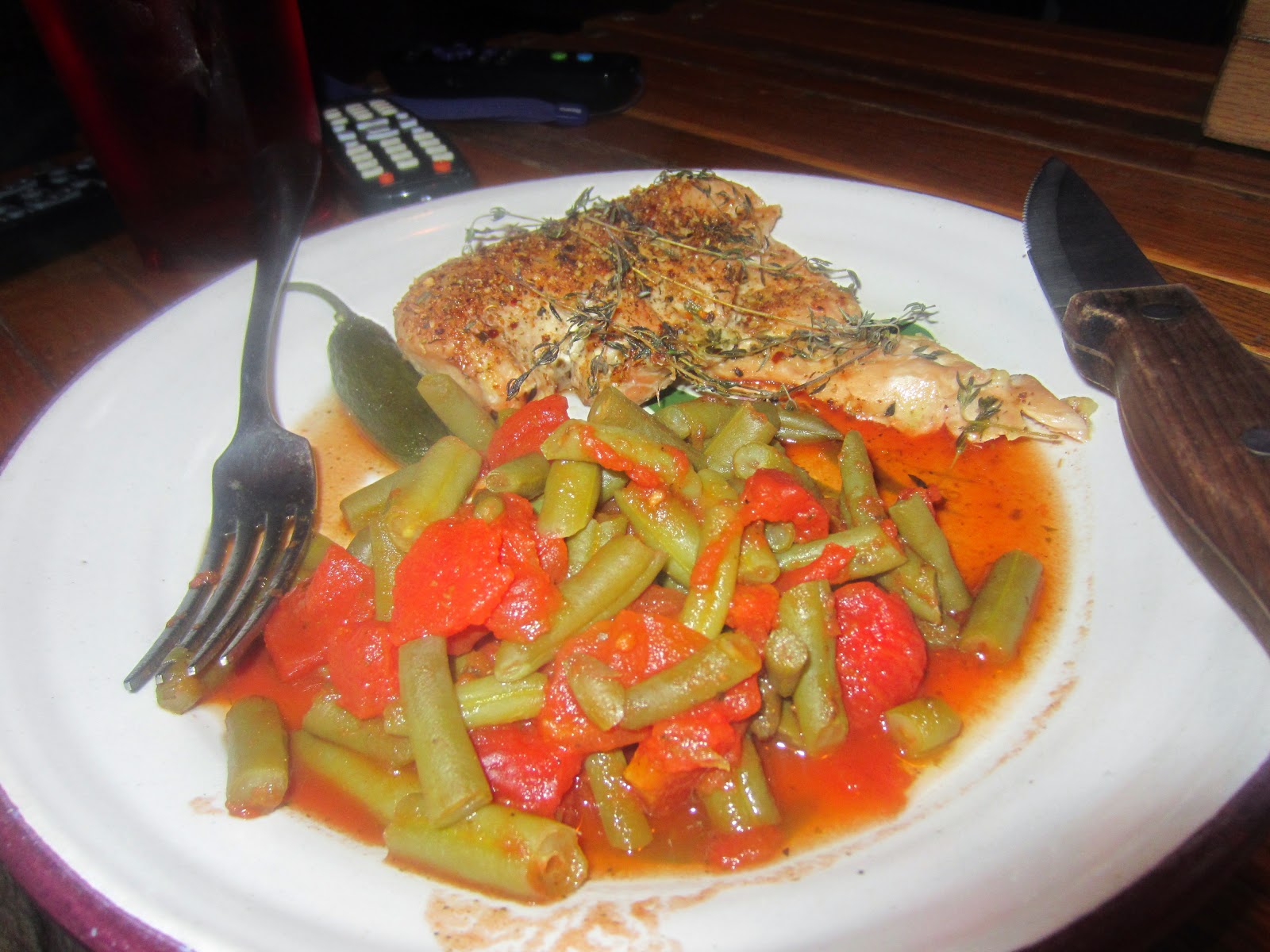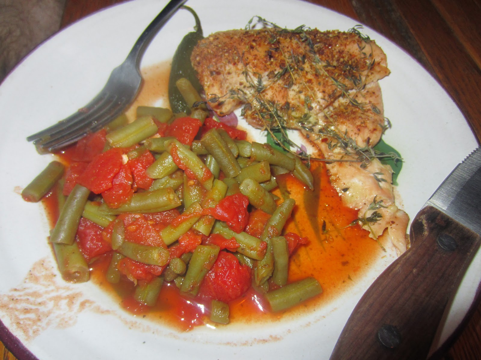 Baked chicken breast with thyme, lime and jalapeno. Green bean and tomato side. Seemed appropriate. Not festive. Basic, sorta serious food. Um, may I be excused from the table?