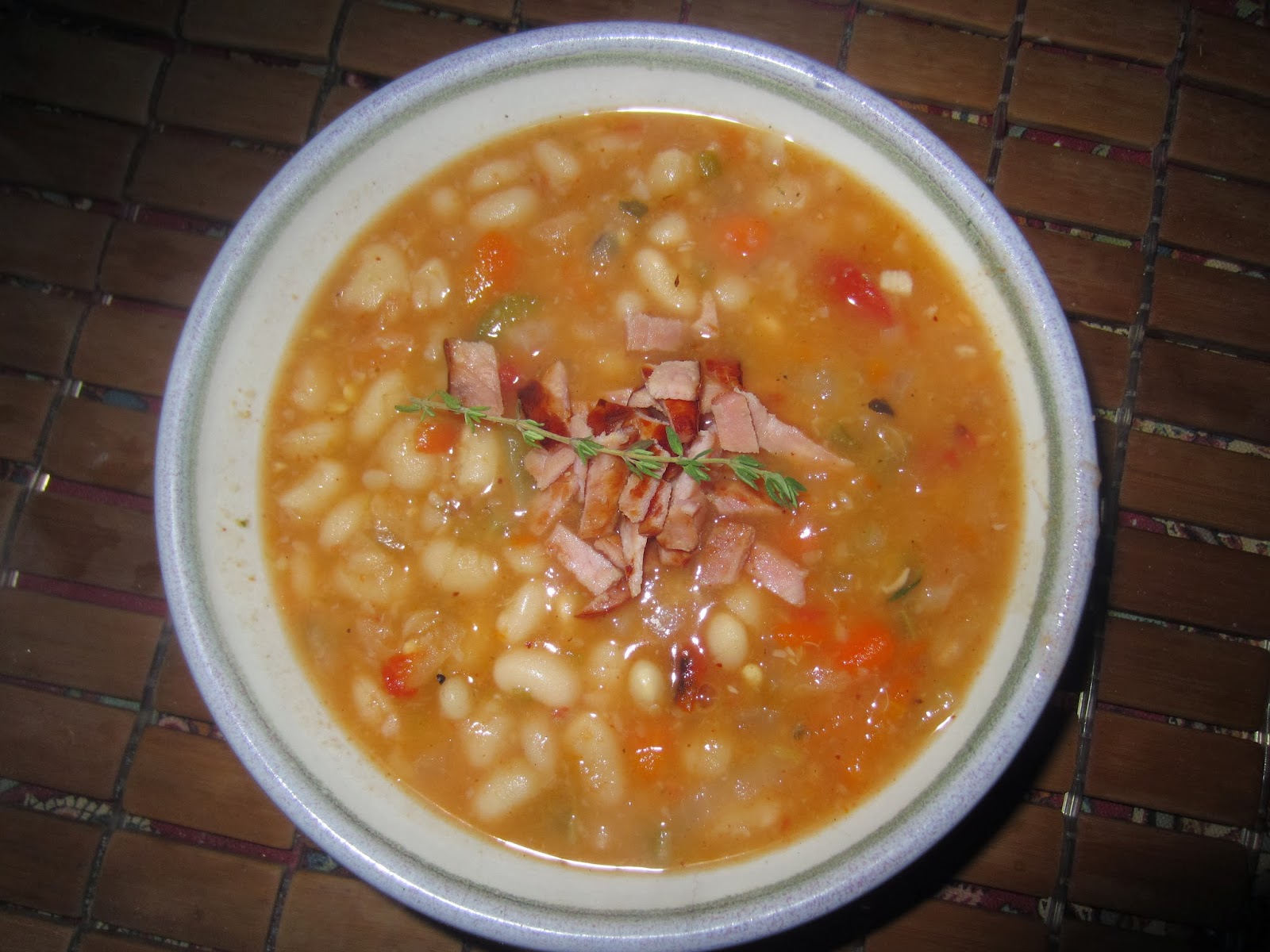 To serve I chopped up some Canadian Bacon and just sprinkled on top as a garnish along with a sprig of thyme.