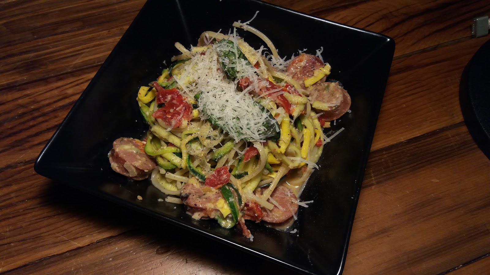 Zucchini Noodles with chicken sausage, sun dried tomatoes & yogurt cream sauce.