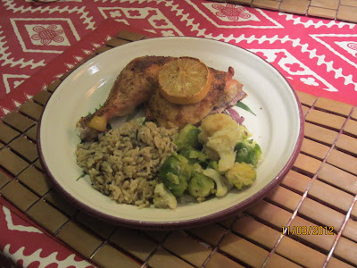 Orange and Cajun spiced baked chicken thighs. Super juicy, super tasty. Great for a weeknight meal with wild rice and brussel sprouts. For us its a slice of normalcy from the whole Sandy fiasco.