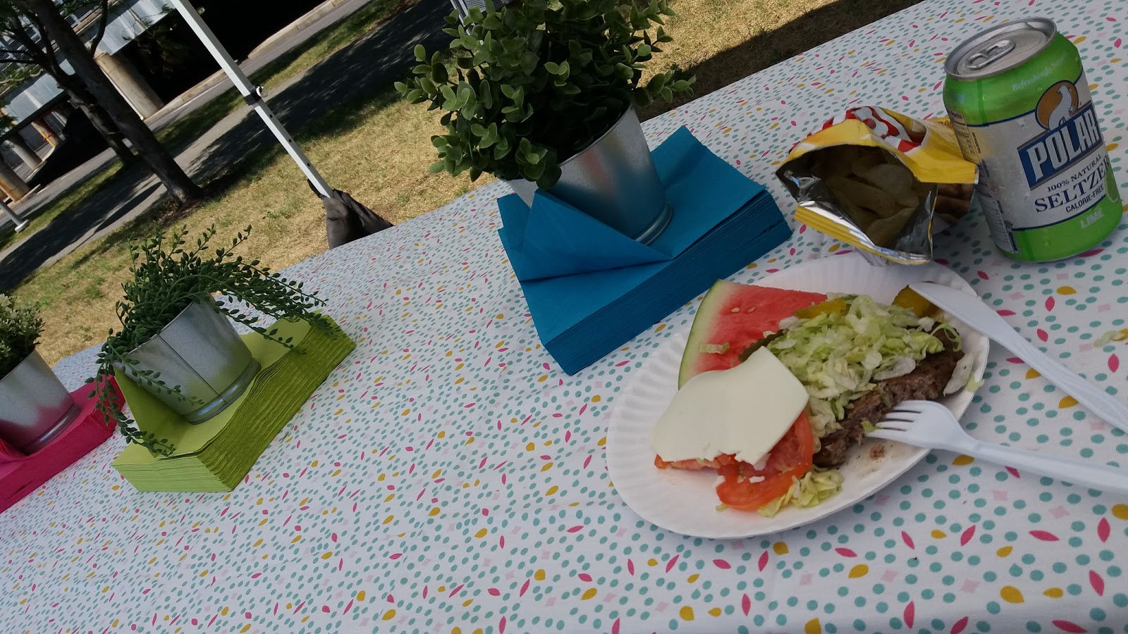The sad long walk through the parking lot to a hot empty table, only to sit and eat alone. One manager flipping burgers and the music on low. If I wasn't so psyched to get a free grilled burger and watermelon I might have cried a little in my seltzer.