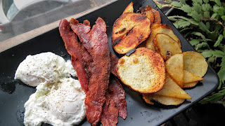 Eggs, turkey bacon and no big shakes here other than I am getting better at making potatoes, thin and crunchy but not fried in a slew of oil.