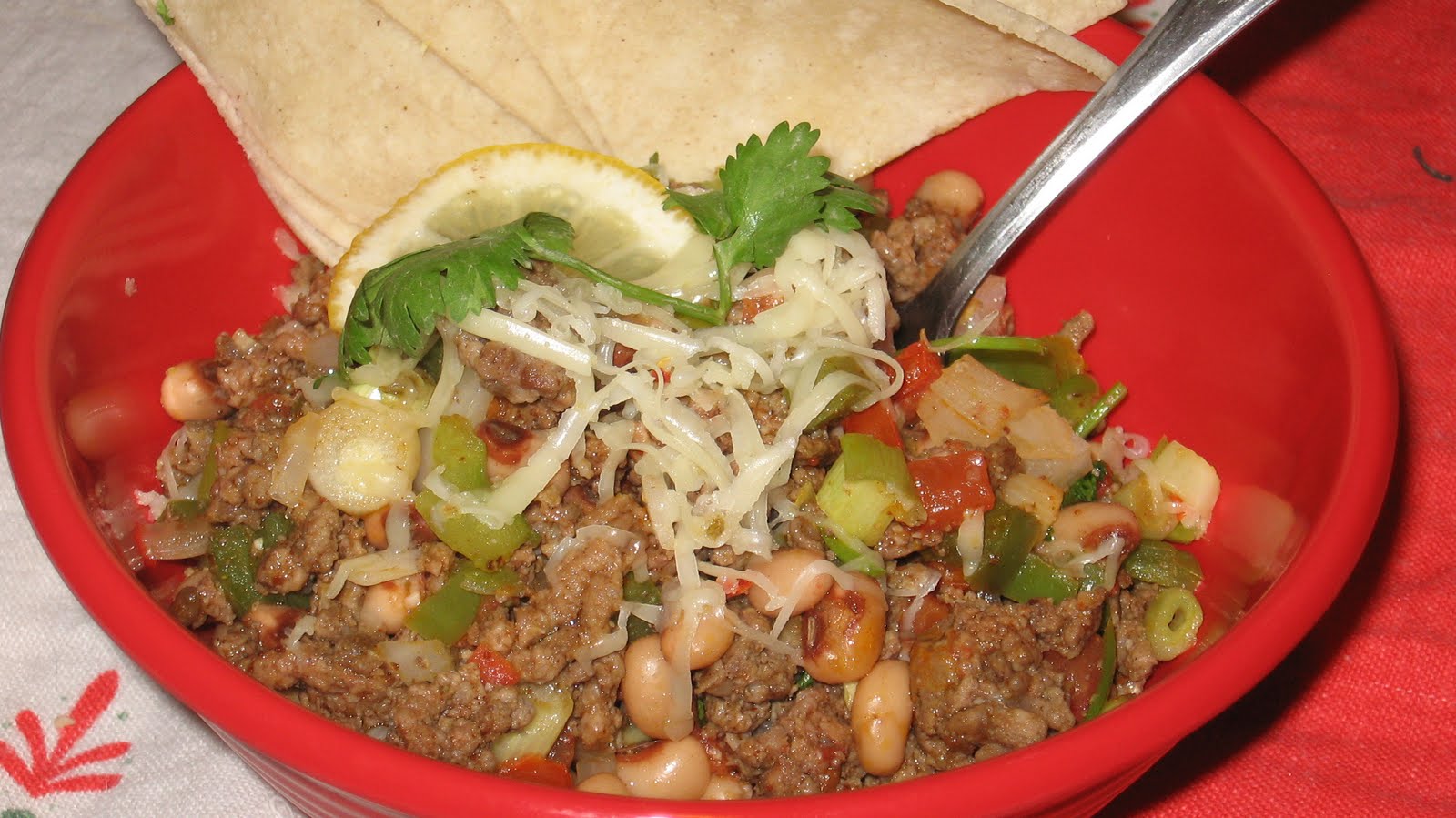 Why write about musicians that I can't stand? No reason. But every reason to celebrate my upcoming day off with a warm black-eyed peas salad whilst watching 'Country's Night to Rock'. (I'll be sure to see Reba!) This salad is great crisp and cold but I'm easing into my fall dishes. And you know, this was as fun as any taco bowl. The vegetables just got stirred in after the meat was completely cooked and seasoned. This way, they stay awake and don't get droopy. I warmed and cut up a couple of corn torts to scoop up the goods. I'm going on record to say canned beans sort of made my summer. The salad/bean combinations are endless and they satisfy, fill you up but also don't make you peter out. I guess beans do give you energy.