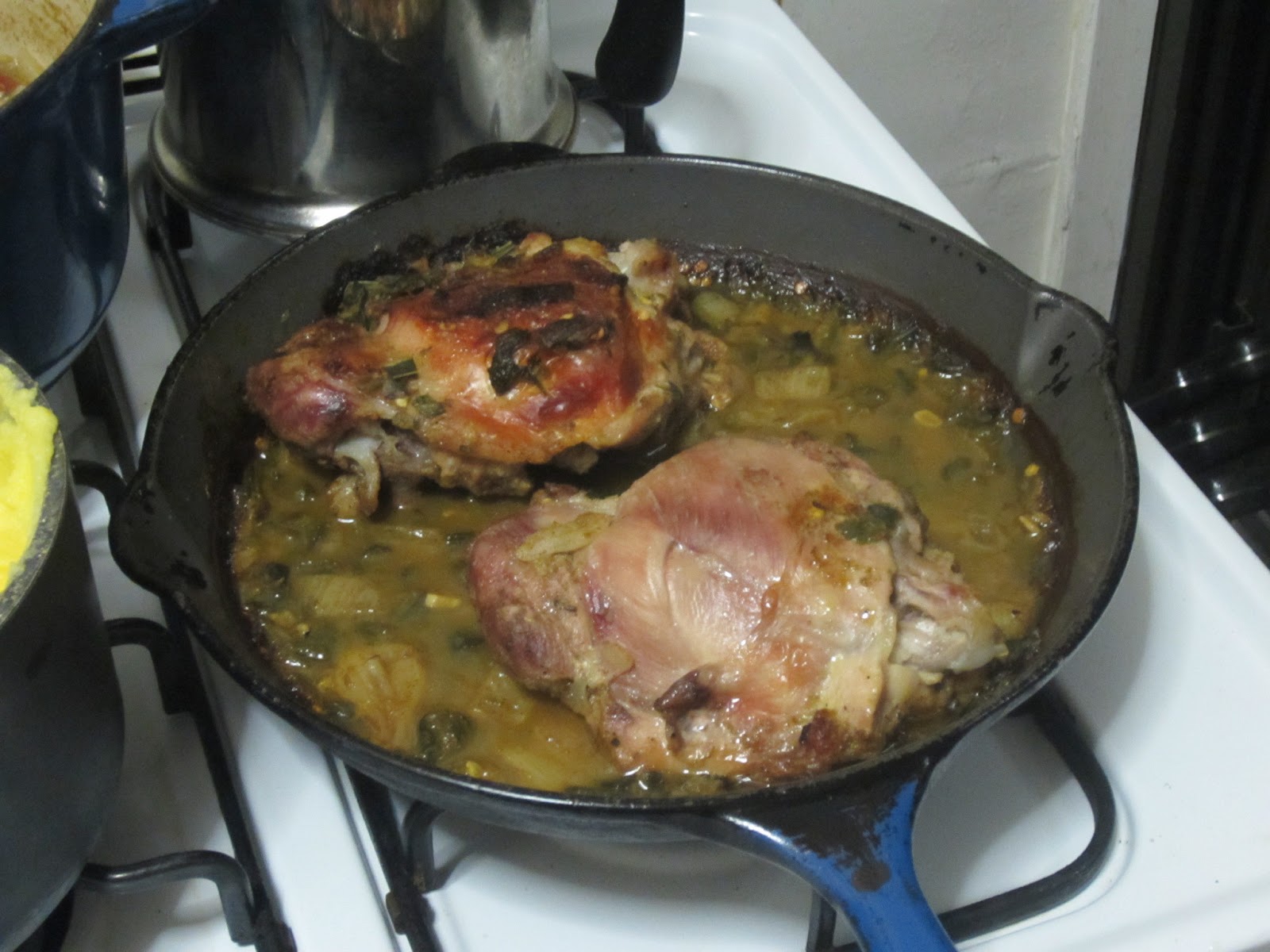 Poblano's have a different flavor than those Hatch chiles when roasted so I figured now I was in uncharted territory anyway and went rogue. The base sauce I ladled over the turkey thighs after browning on the stovetop and stuck them in the oven covered for an hour and 1/2.