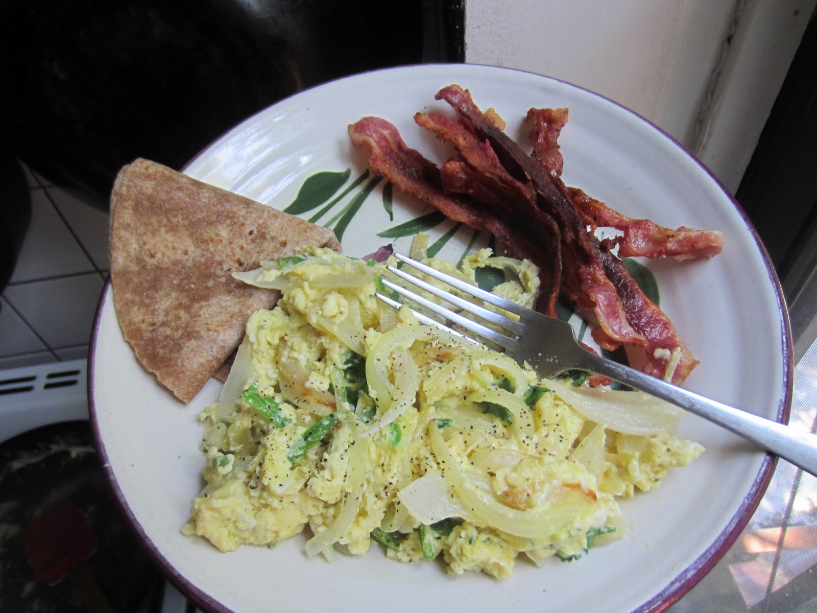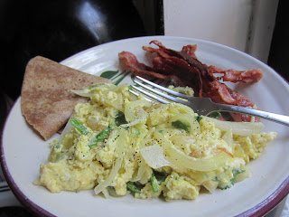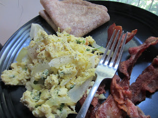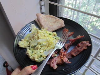 Just scrambled eggs with fresh 'penos and sweet onions but still good. My point today was I believe little by little we snuck bread back into our daily food. We had stopped eating it for a while and boy did the weight just go right down to a more comfortable body fit. It's as if your stomach goes into some better balance without the bread. I felt better and lighter and not bloated.