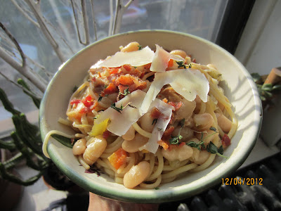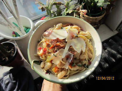 So I tried connecting the positive dots. Pasta makes me feel content. P doesn't eat pasta so I enjoy it solo in smaller portions and healthier combinations like this turkey bacon, white bean and thyme with angel hair and parmesan shavings on top. I still get my fix but have energy from the beans and vegetables for getting things done and keeping active, getting out, listening to music, taking photos, writing and anything else.