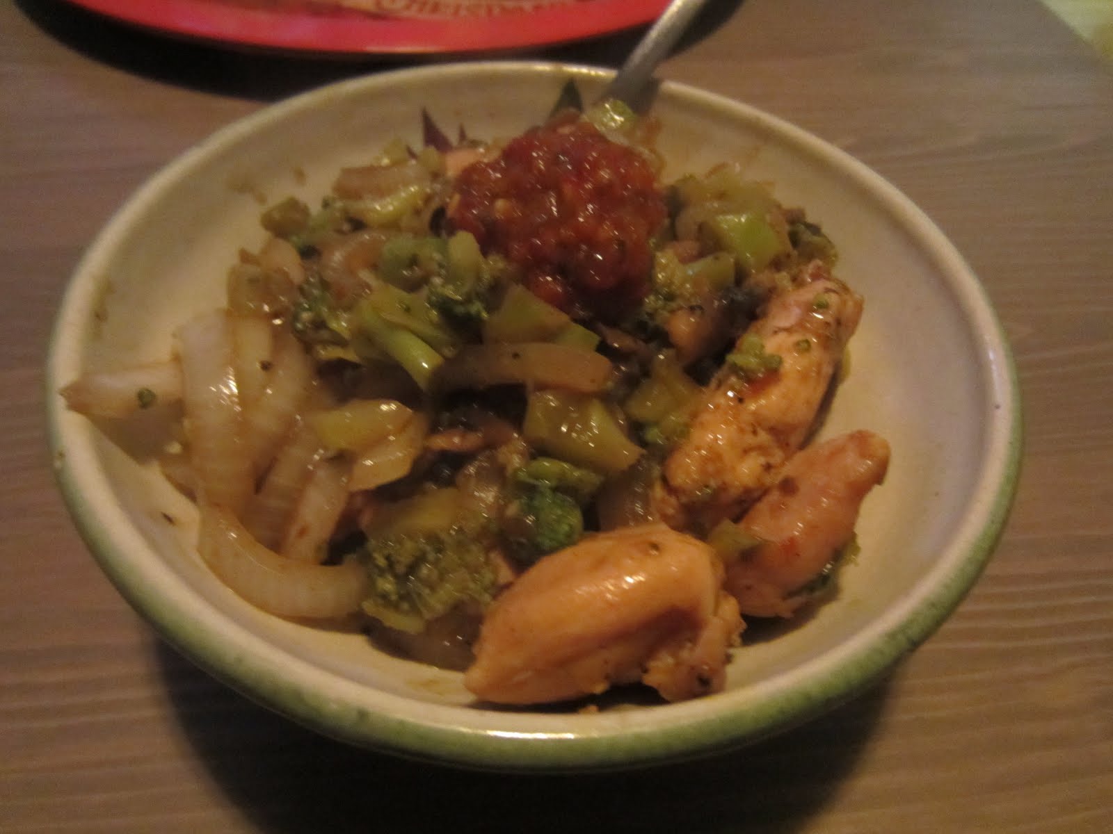 Chicken breasts cut in chunks and cooked in a wok with broccoli and onions, Sriracha and black bean sauce.
