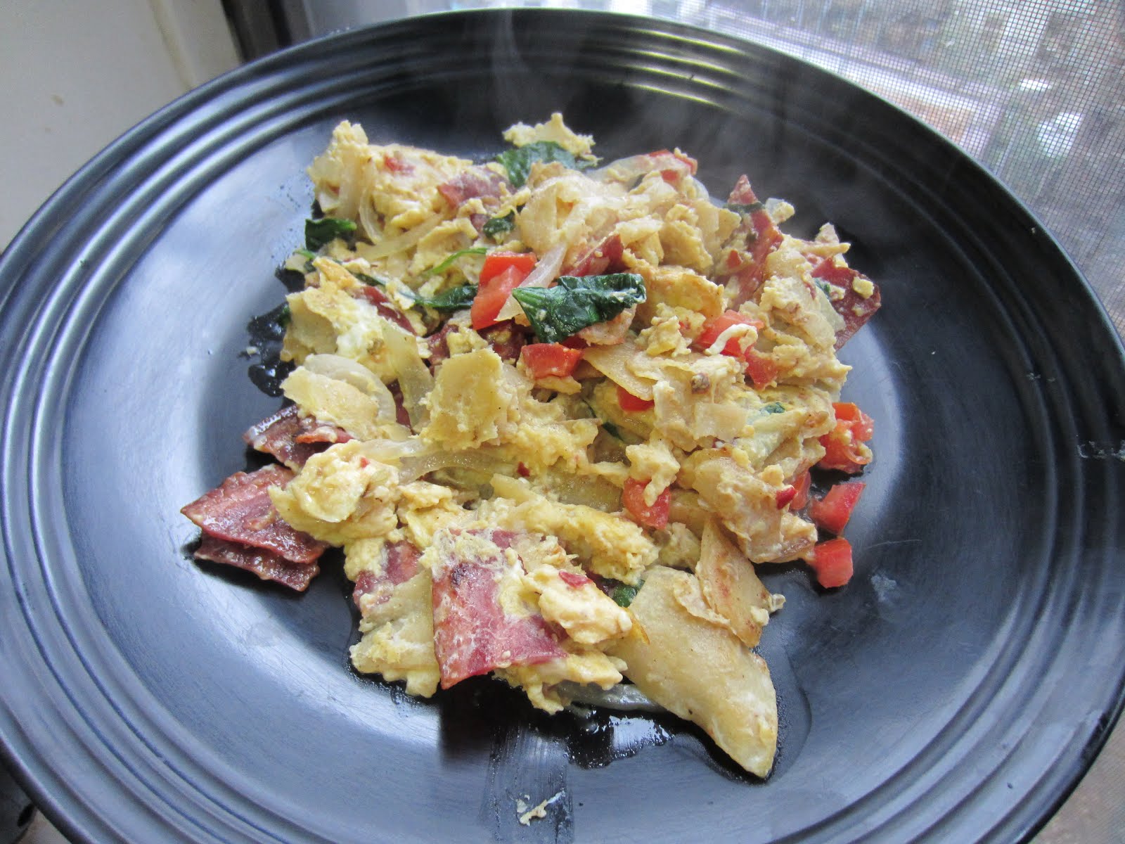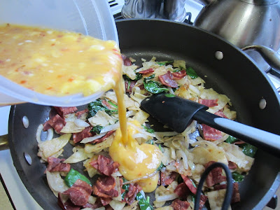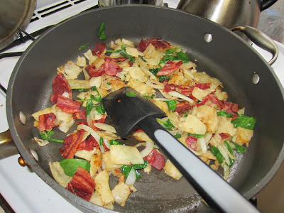 I call these 'Cheatin Chilaquiles' because I didn't have a homemade salsa, so instead I just added two big tablespoons of Srirachi sauce to my eggs. I toasted up the cubed soft corn tortillas in a small amount of oil along with the onions and turkey bacon. I threw in some fresh spinach leaves for color before stirring in the seasoned whipped eggs.