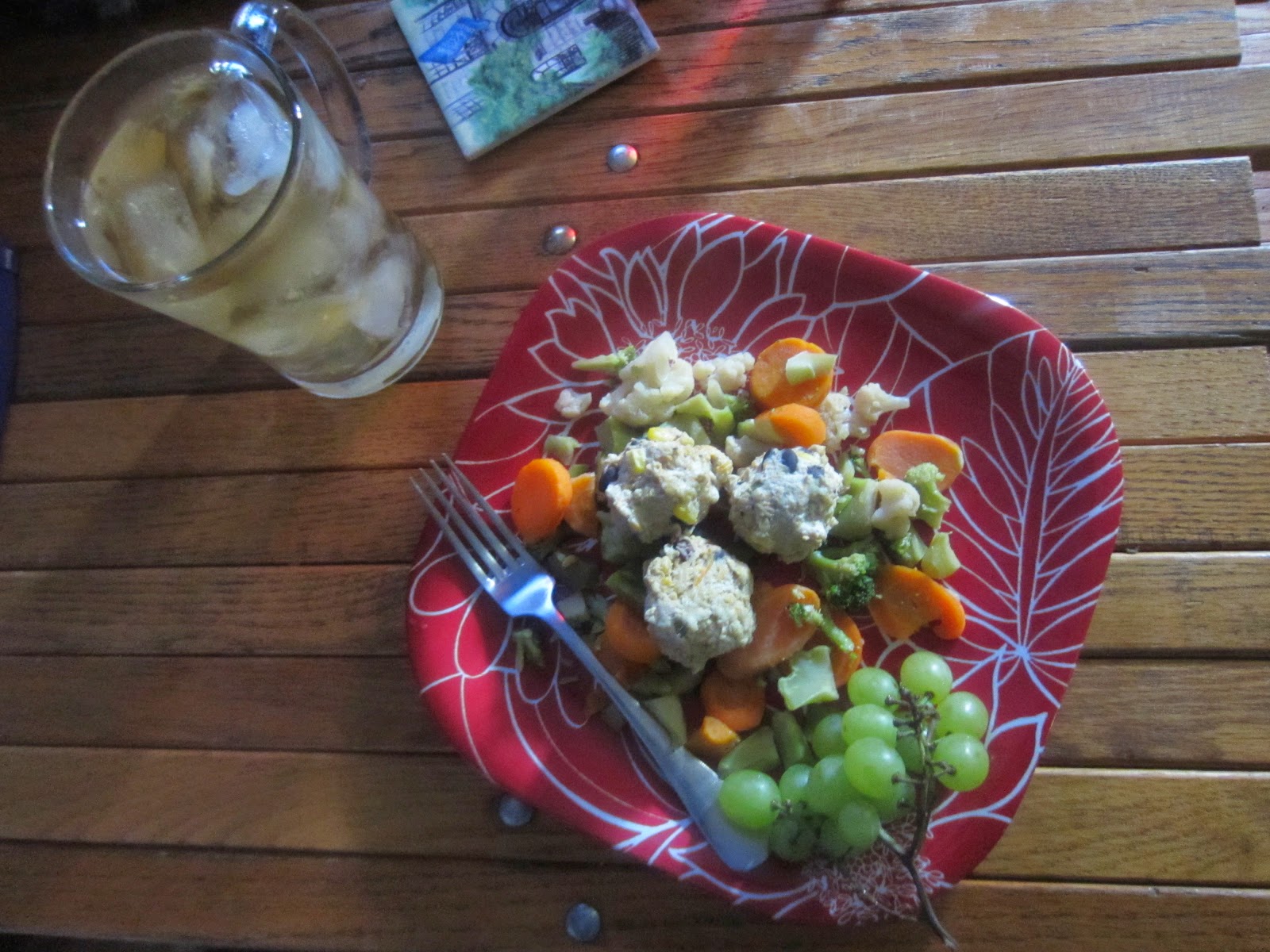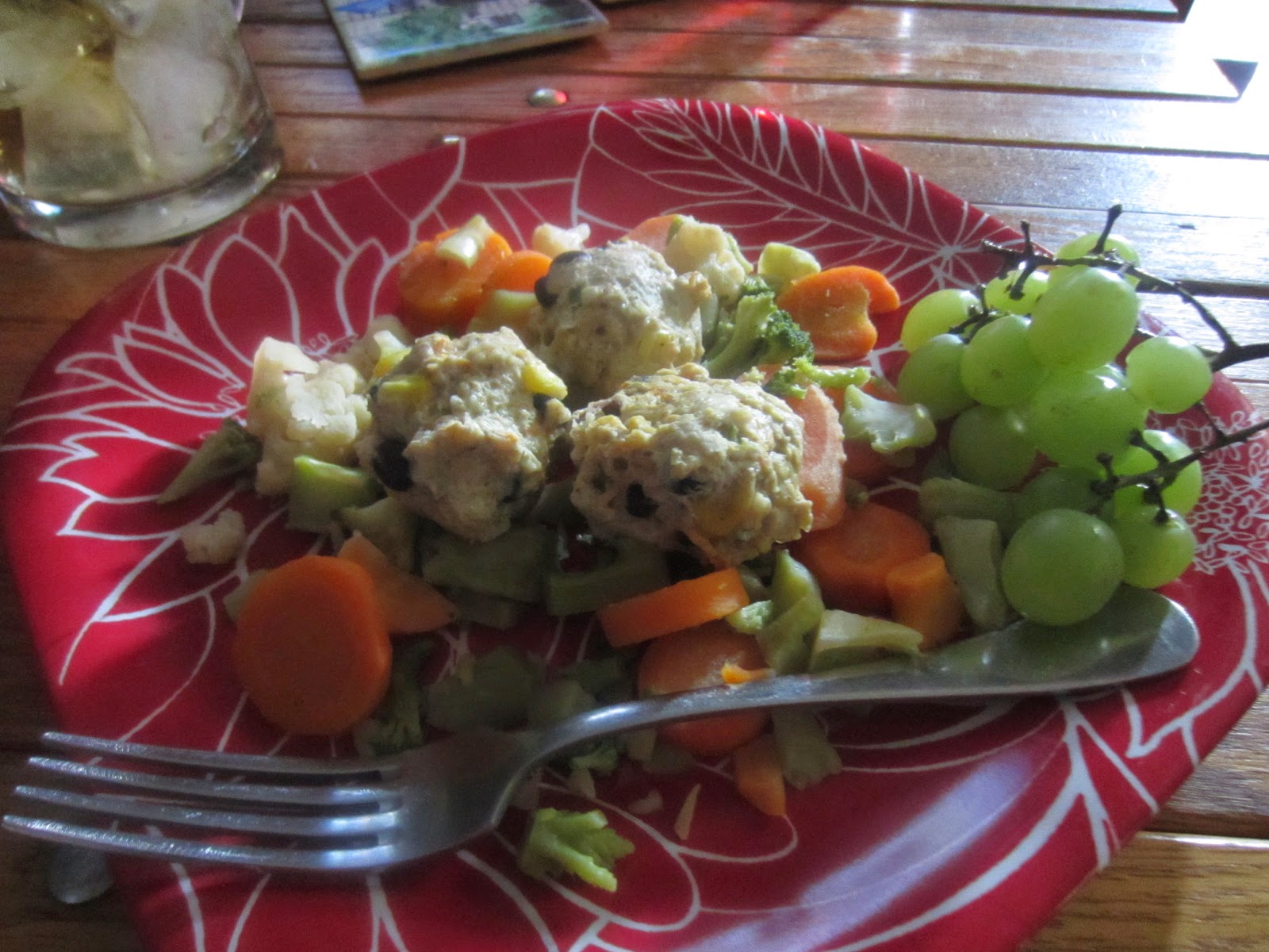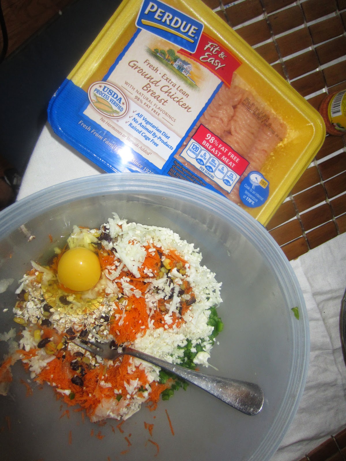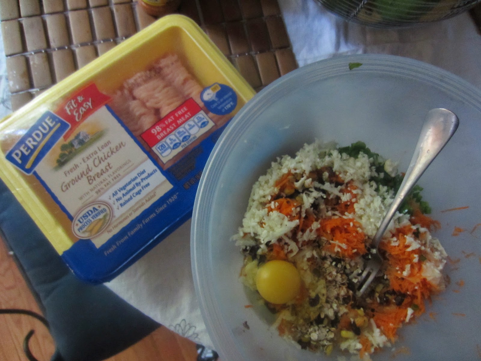 I took ground chicken, grated cauliflower, carrot, onion, diced jalapeno, oatmeal, garlic, one egg, left over frozen corn and black beans, s&p mixed it together and formed balls.