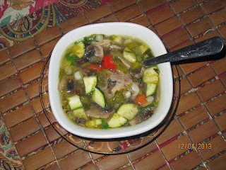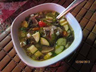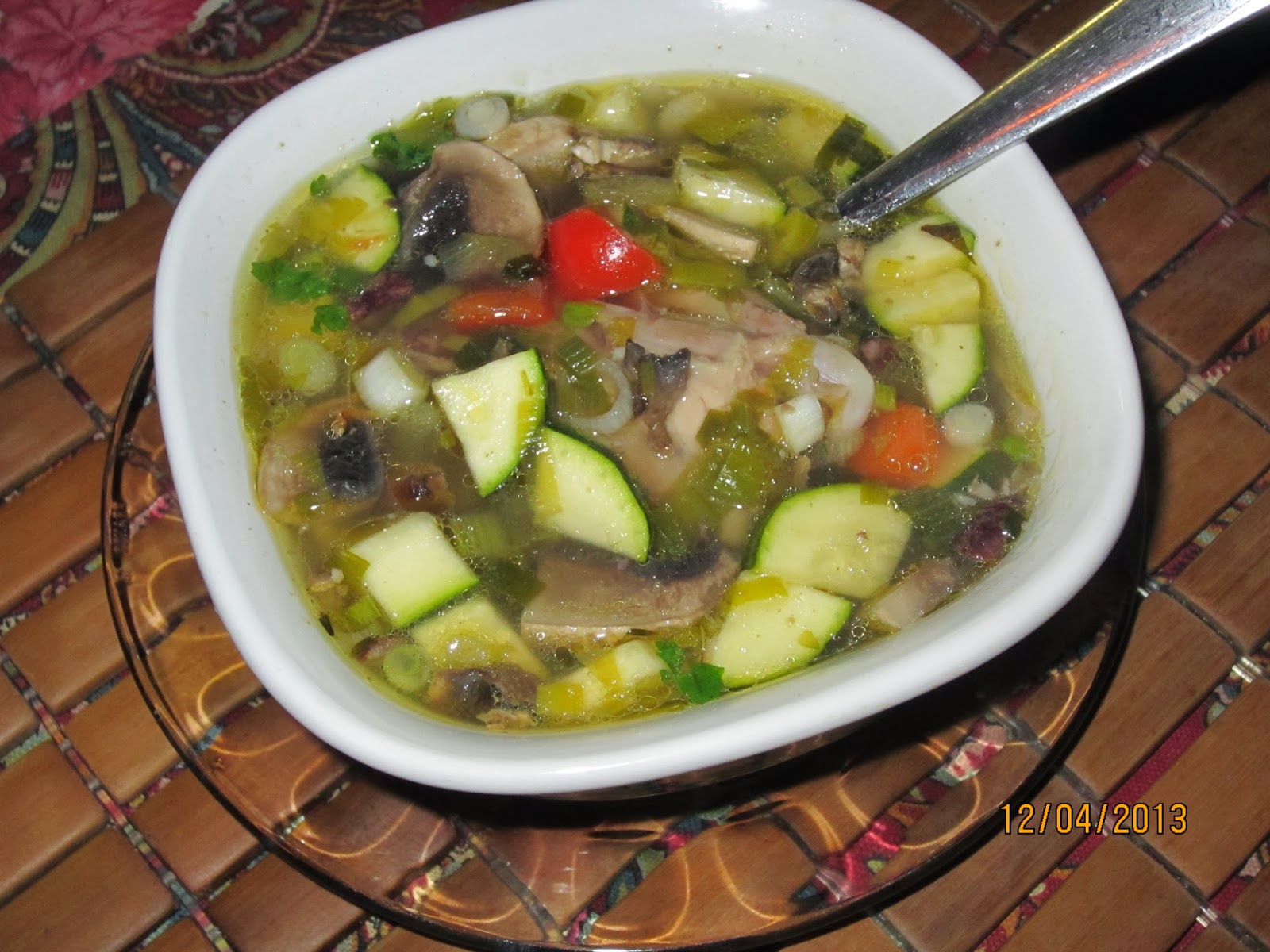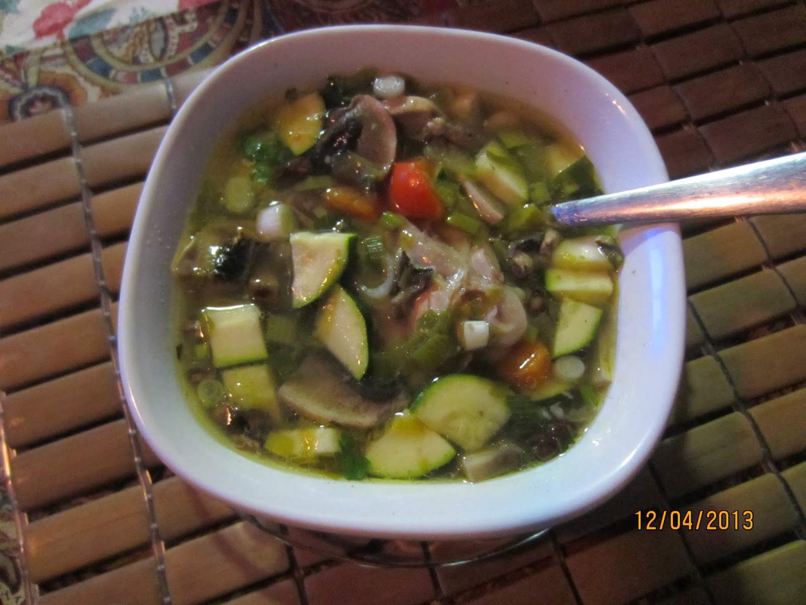 I started with big chunks or carrots, celery and after 10 minutes put in the zucchini, mushrooms, red bell pepper, green beans and then for a big splash of zippedy-do-dah, lots of fresh oregano and cilantro and green onion at the end to serve. Comfort food for this cold early winter while keeping a light after effect on the gut.