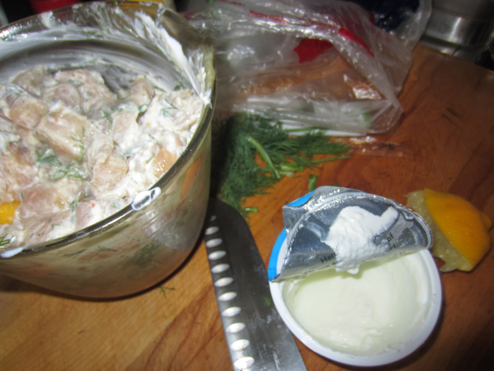 As you can sort of see, I burnt the chicken which was a shame since I took the time to marinate it in yogurt and lemons, dill and garlic. My mistake was cooking it on my hot grill pan. These little nuggets would have been best baked in the oven.