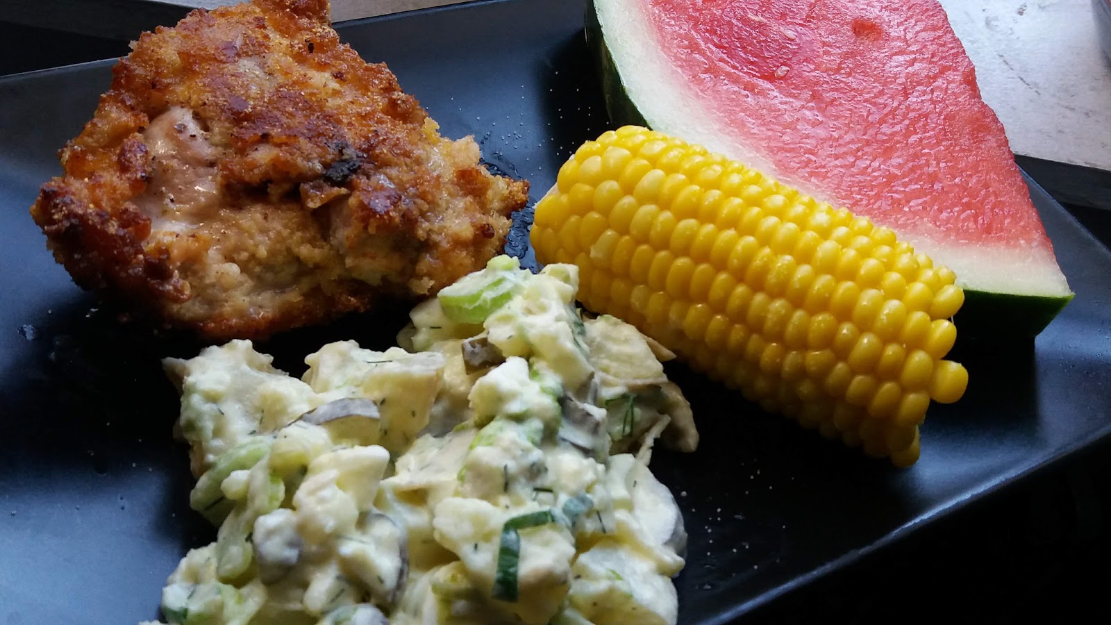 American food brings everyone together in the summer. I grew up near the cornfields of the Midwest. Rows and rows of winged Dekalb signs before it was owned by Monsanto. If we were lucky we could buy a bag full from a farmer's stand and shuck it at home. We would wait for Dad's deliberation on if it was sweet enough. It made him so happy when it was. My mom made the best potato salad and used Rach and I to help cut the pickles and mix the yolk with the mustard, guiding us on how much to put in each time. My dad plucked our heads to check for ripeness on the watermelons at Eavey's grocery. It was a major treat to buy a big bucket of Kentucky Fried Chicken back then and it never gave you the squirts like it does now. When you put all of it together, summer meals were a real American family experience in the 70's.