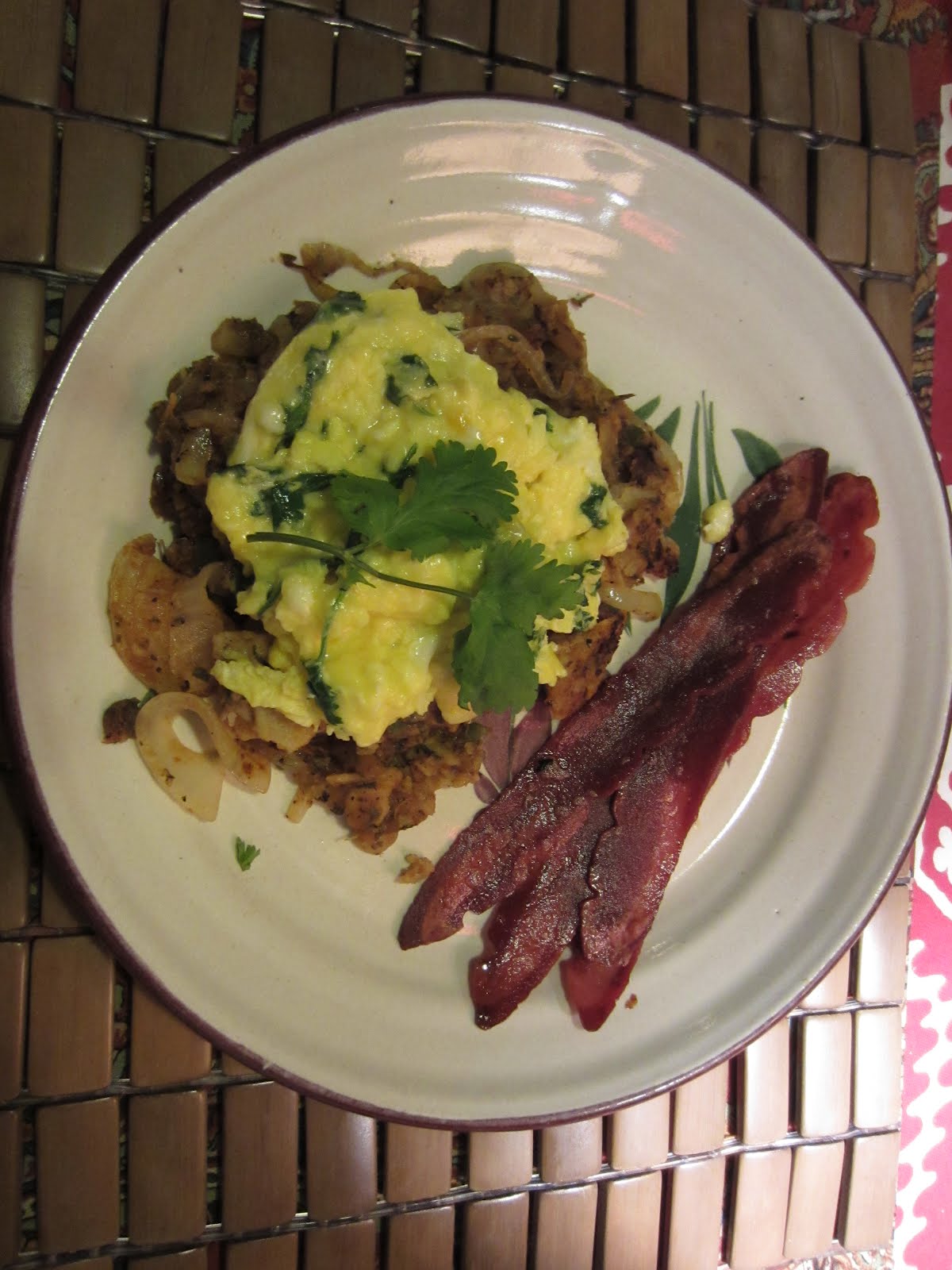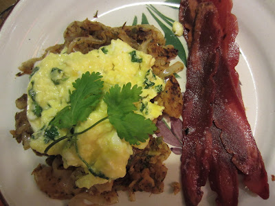 I went to sleep thinking about what to make for breakfast. I wanted chilaquiles but I also wanted pure creamy fluffy scrambled eggs. I had some leftover roasted tomato salsa and sweet onions so I added those to my sauced up corn tortilla slices and put in a hot wok to crisp.