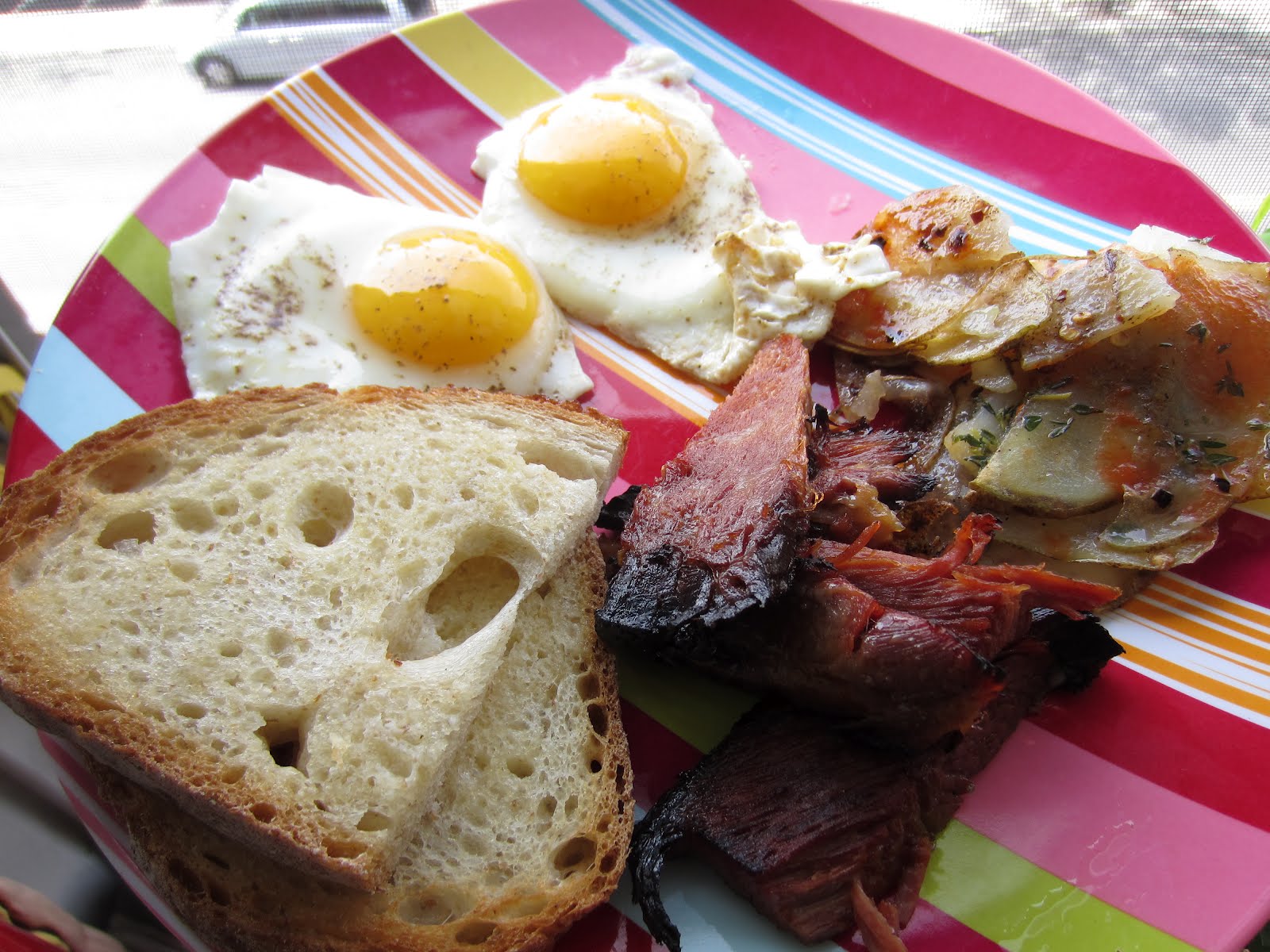 But we had the most fabulous smoked baked ham waiting for us. So I just had to make ham and eggs, fried potatoes with toast and coffee and orange juice.