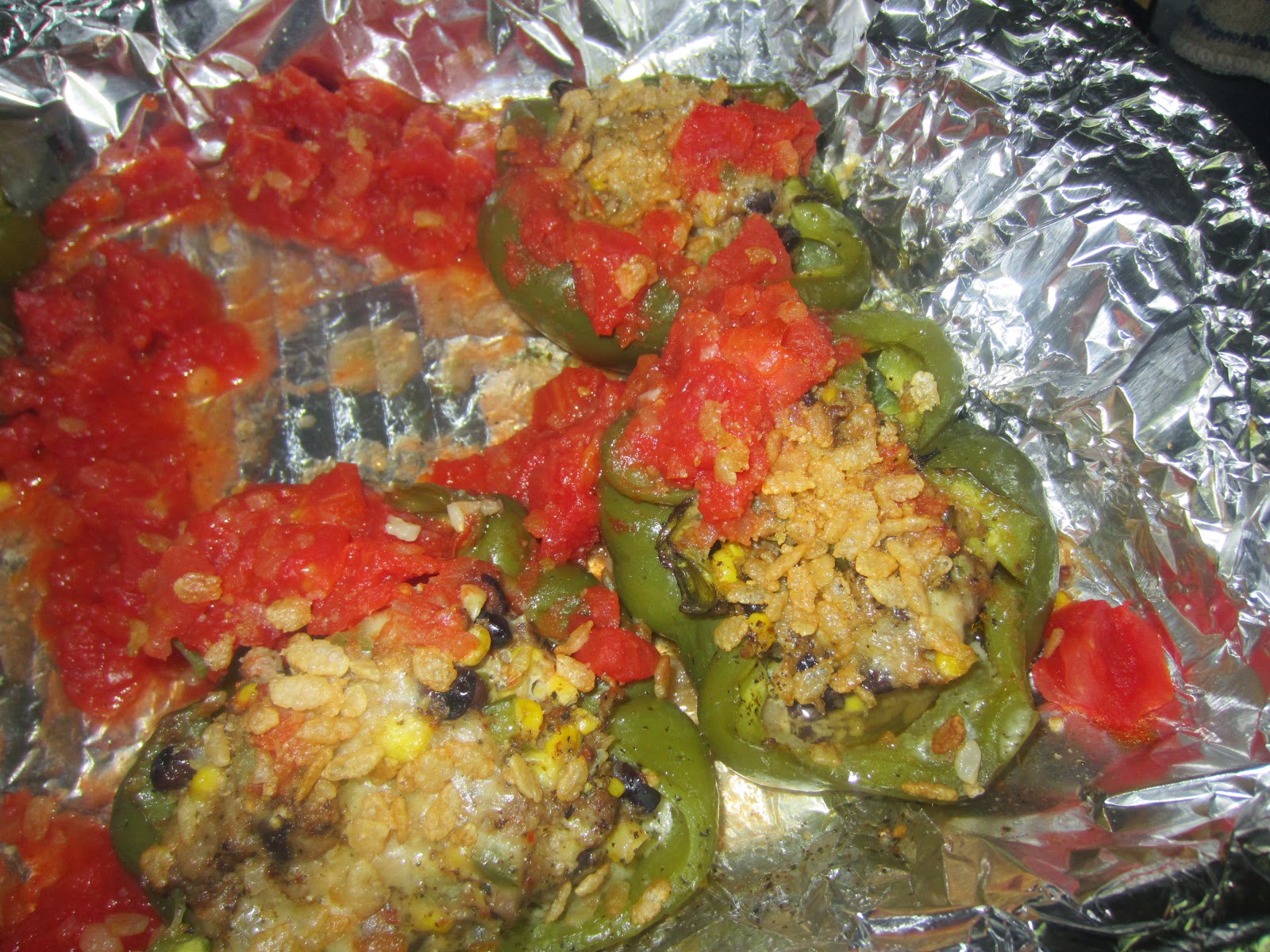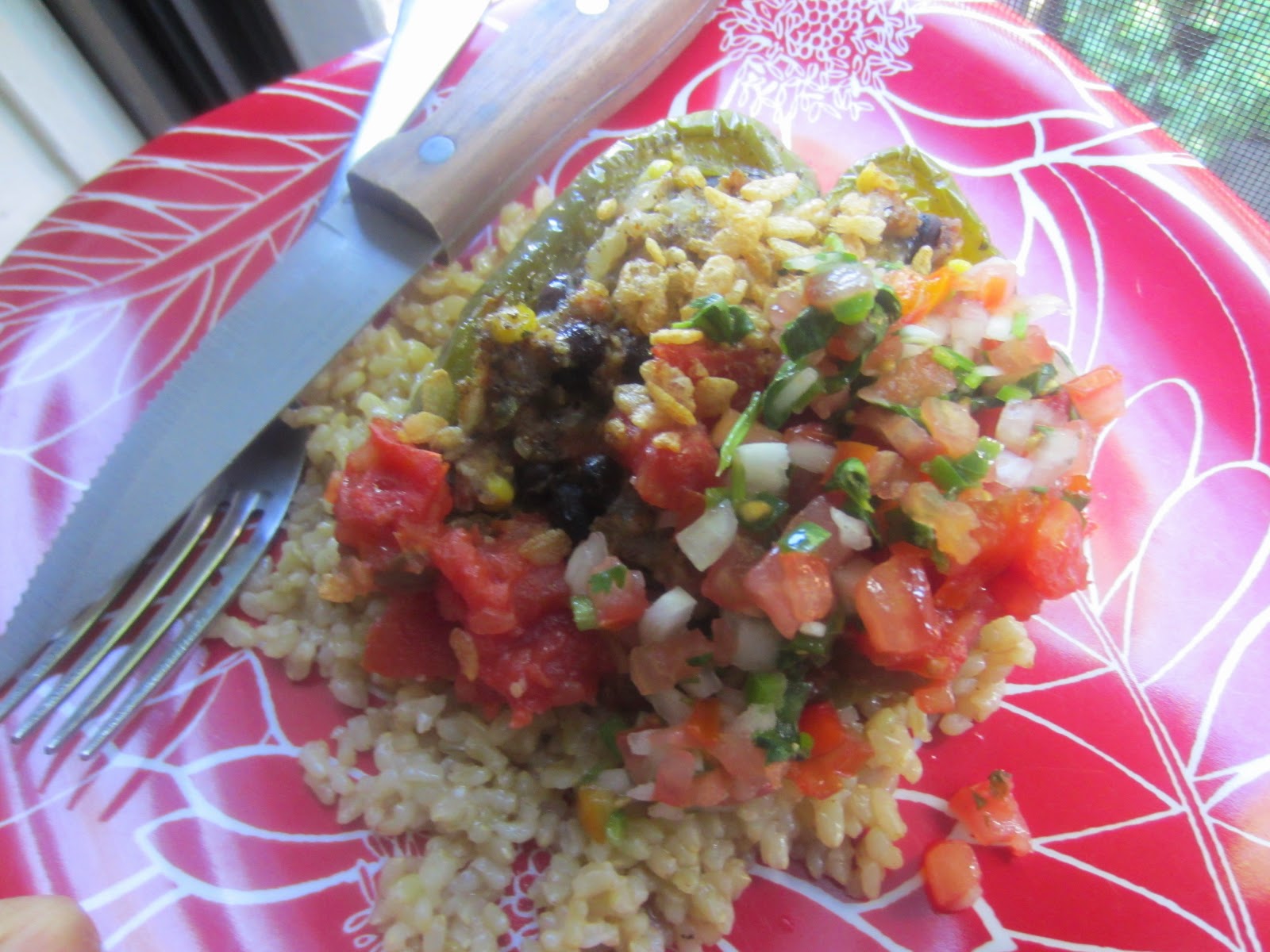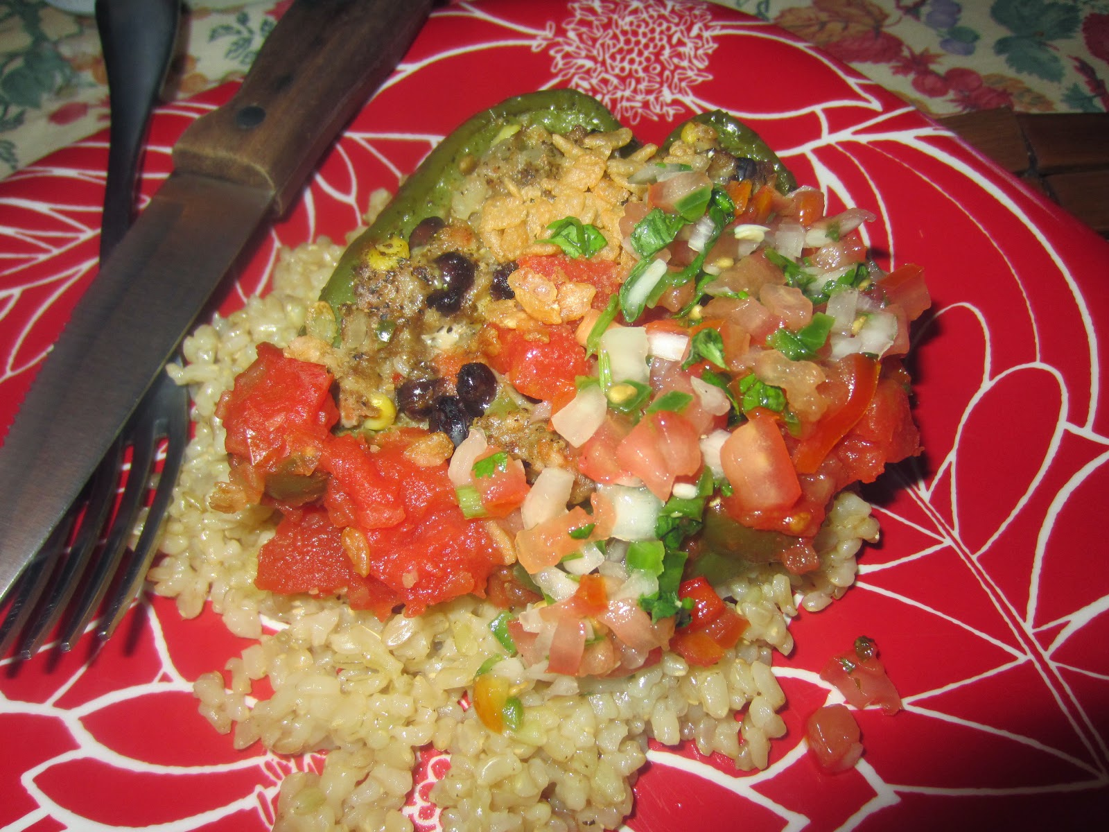 A deep flavored dish becomes half as time consuming if you already have a great base to build it off of, like this meat mixture. A quick stuff, some canned tomatoes over top and into the oven for 40-45 minutes. Enough time to get some brown rice made. More leftover fresh pico on top to finish. This had the eye appeal and wow factor because anything stuffed is appetizing and makes your mind think 'mmmmm...stuffed hot something'........