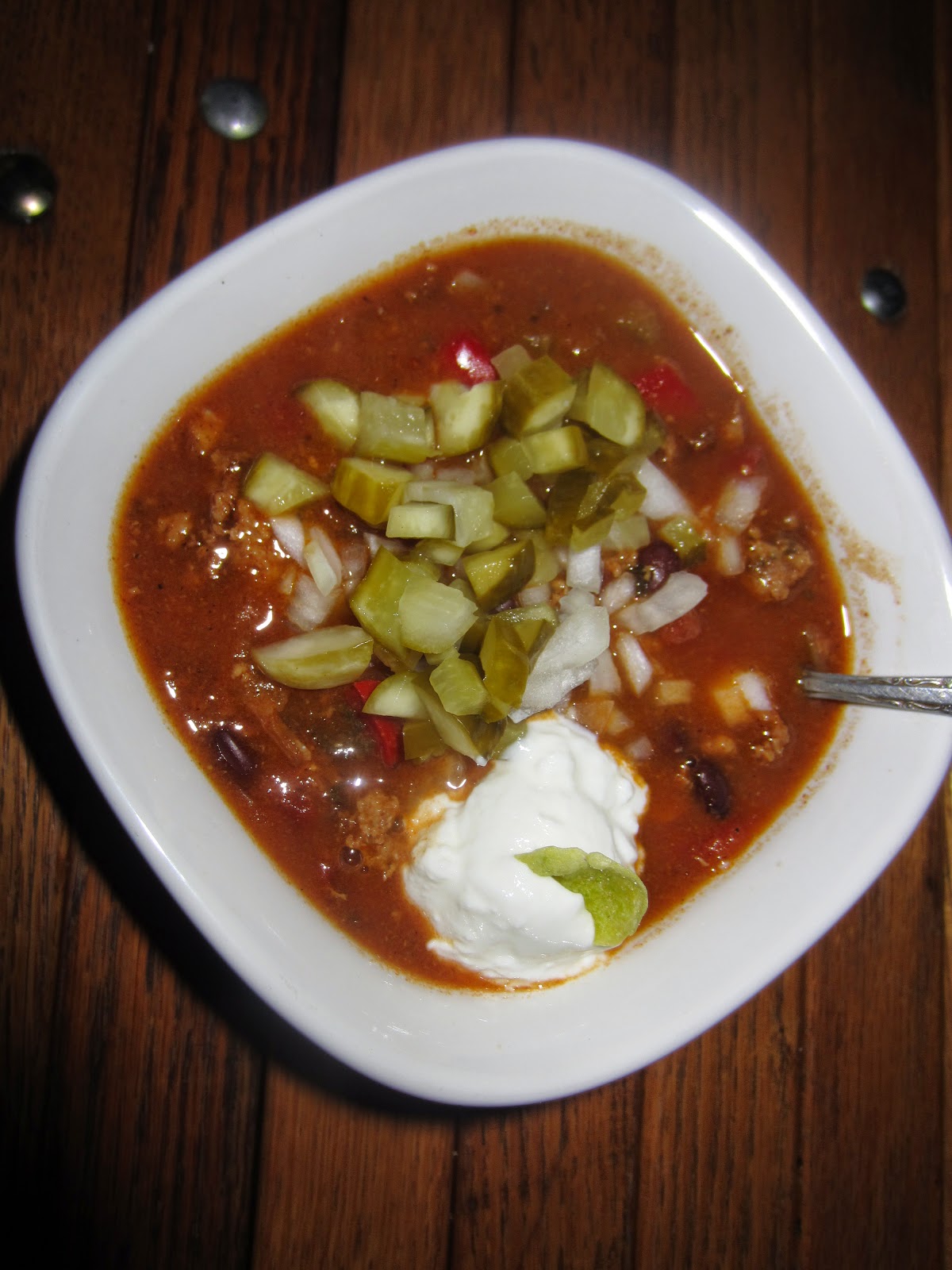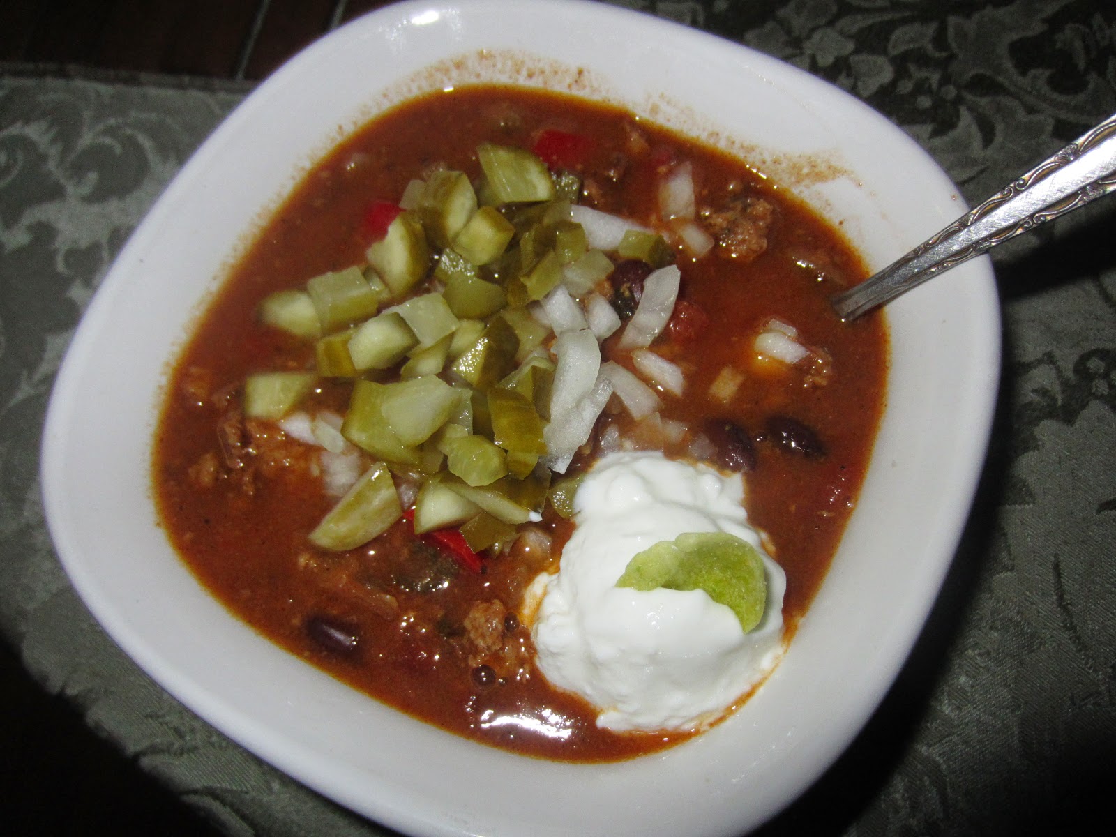 I like to blow out P's ass for sport so this 5 alarm Fiesta Chipotle Chili was cooled down by a dollop of Greek yogurt and some cold diced pickles and onions.