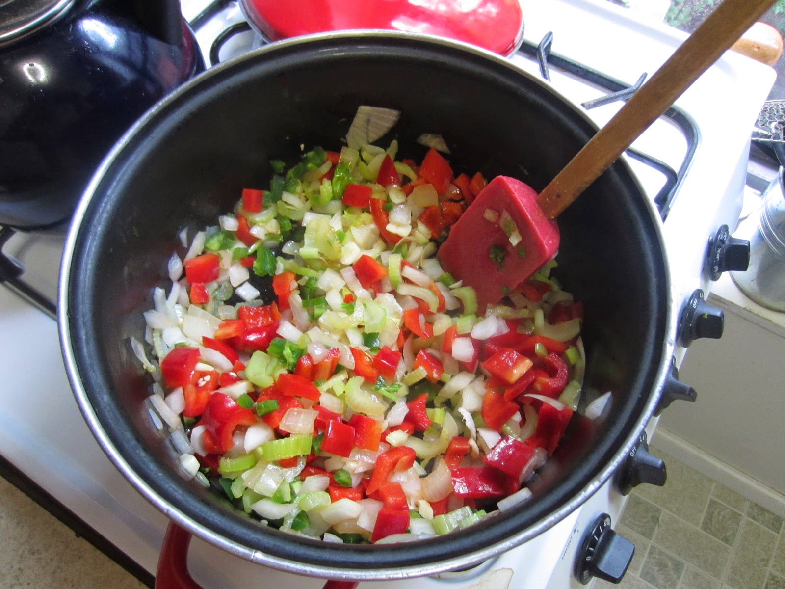 I like my chili packed with goodies so I started my base with tons of onions, celery, carrots, red pepper, garlic and jalapeno peppers. I've perfected the quick cook method by adding canned beans, this time pinto and black, canned fire roasted tomatoes, and beef stock to the seasoned meat. After it comes to a boil I add a 1/4 cup corn meal for thickening and this time 3 heaping tablespoons of Chipotle peppers with sauce. I'm not a fan of adding anything sweet to chili but I would turn my head if you added a couple of squirts of good ketchup.
