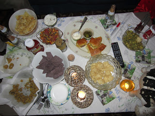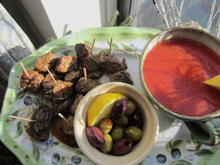 Nothing was hugely impressive. The heat was stifling that day so I had to try to prepare everything before they arrived to cool the apartment down in time. I made green apple salsa and peach salsa with chips which sort of limped out in the heat. Tweren't as refreshing as they could have been. I did fried pickles and pickled jalapenos in a ranch dipping sauce. Those are best straight out of the fryer but they were sitting out for a bit. Meh. I had steak bites and bloody mary dipping sauce (pictured from a past event). Those were good especially because it was super cheap steak but I took the time to marinate overnight. And tiny cheeseburger sliders. Surprised not to find slider buns so I just cut hot dog buns in half! Cool tip! The backstory was a back kitchen queso fundido fail. Another example of my short attention span with following recipes. I forgot to add the flour before mixing in the cheese to the roux type of sauce and so the cheese just became one big blob that kept hardening more and more. I had it flavored so nicely with beer, garlic, pepperoni bits and three kinds of cheeses. I refused to give up on it but finally realized nothing could revive the rock hard mass. It was to be the wow dish too. But you live and learn and sometimes you screw it up.