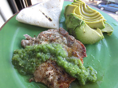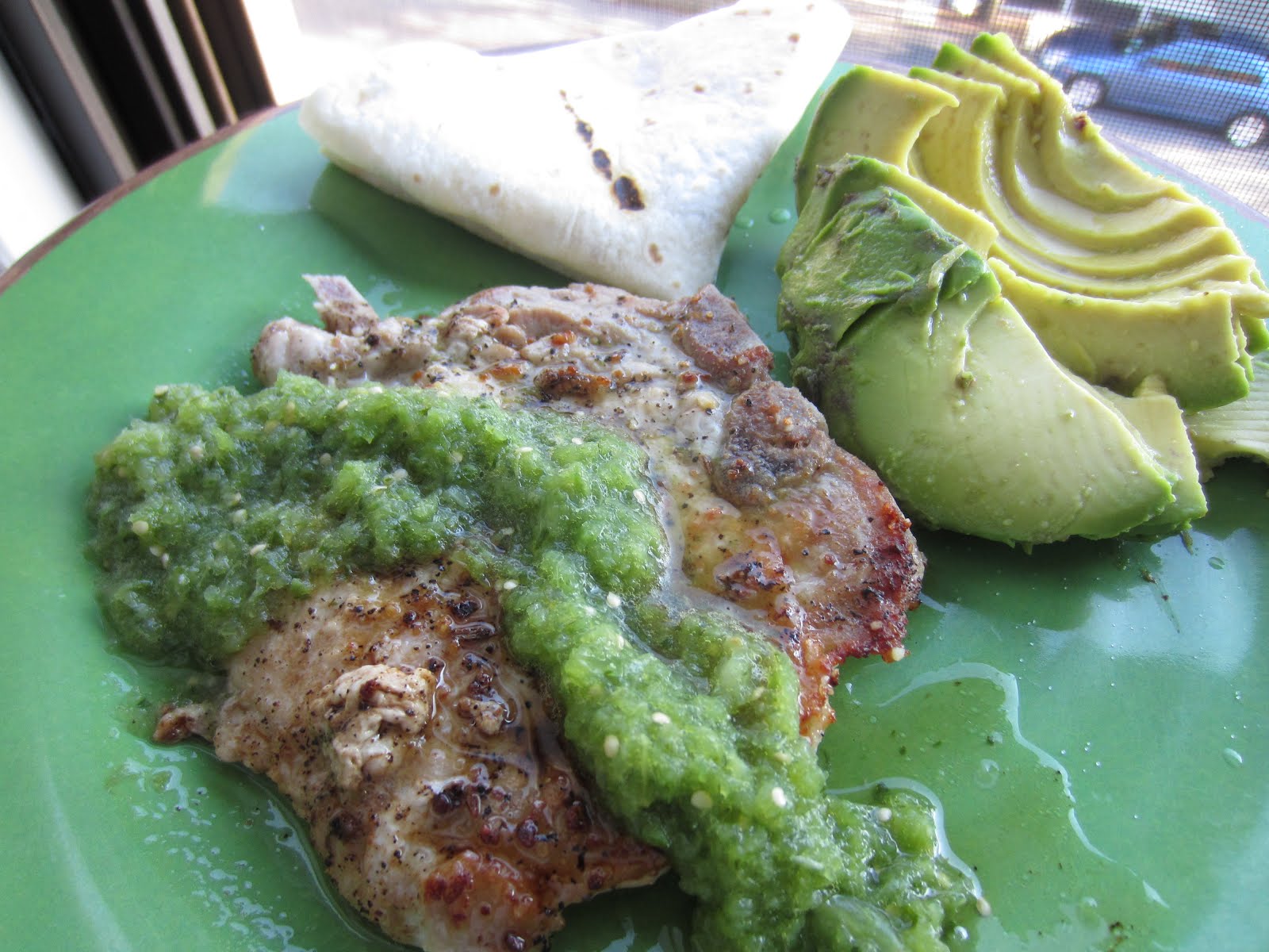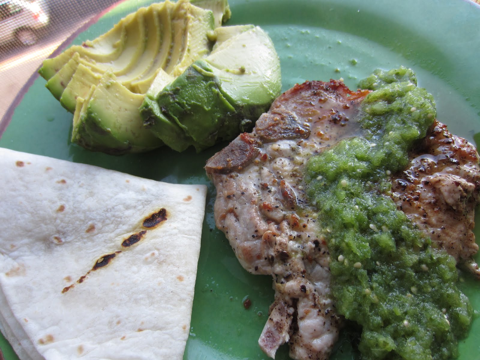 Roasted tomatillo sauce is really great on steaks. And now I discover that raw tomatillo sauce is spectacular on pork chops!