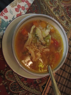 Is there anything better than chicken soup? I mean more pure or more straight to the soul of your stomach kinda soup? The broth, when you make it from scratch, mmmm. And then the way the vegetables, subtle as they may be, bring all this authentic homey taste. I love chicken soup, I LOVE chicken soup! My grandmother on my dad's side used to make the simplest but bestest chicken soup with big chunks of cabbage and she'd add a little vinegar. It was clear and wonderful, very delicate. You could see all the individual ingredients. I can still smell it in my head.