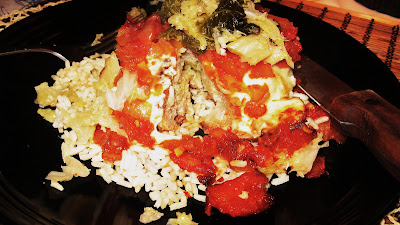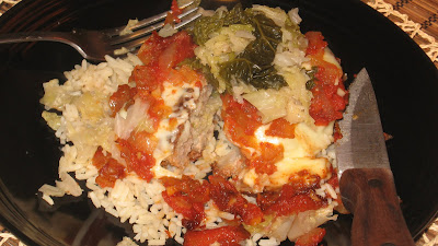 Anyway, I took my ground turkey and added bread crumbs, egg, onions...rolled them into burgers and then made big pockets. I stuffed those pockets with the cooked cabbage, more bread crumbs and I made the traditional tomato sauce to put over top. I baked the burgers for 30 minutes. I served these over Jasmine rice. These were juicy and divine! I could see doing a giant one, as a stuffed meatloaf as well.