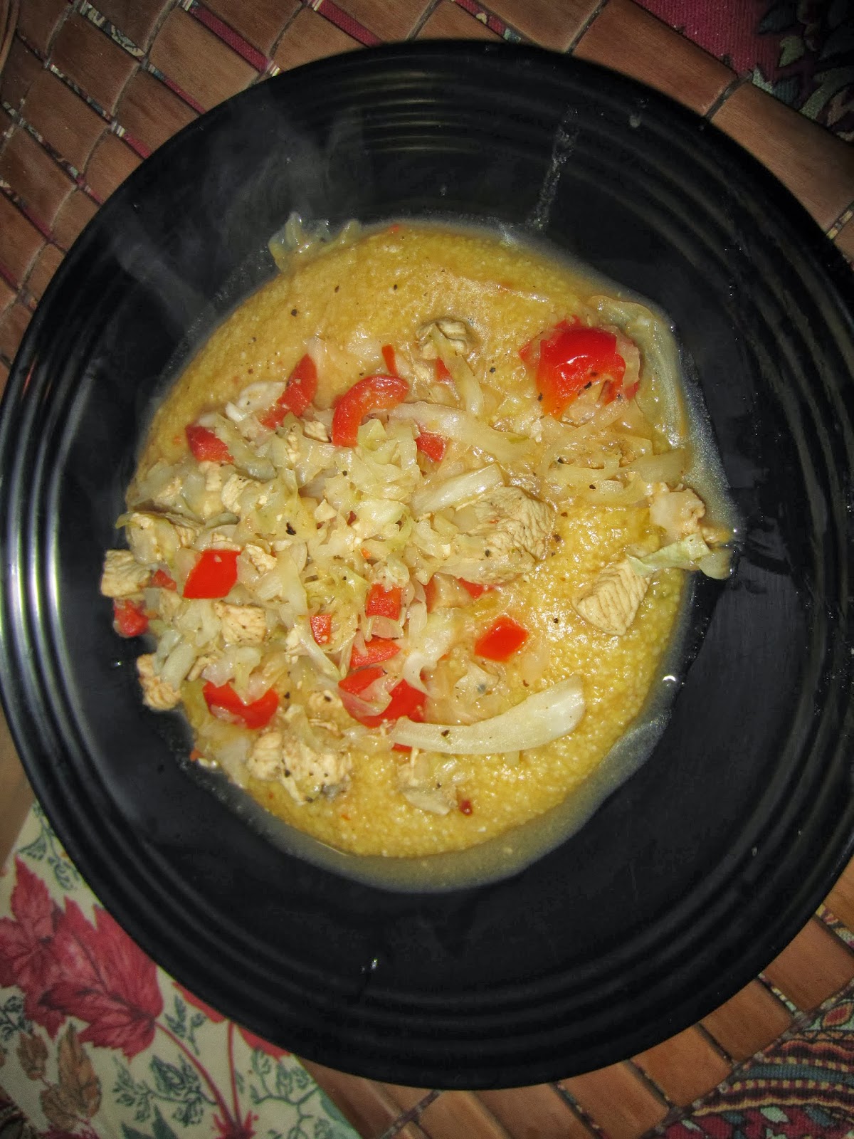 I've talked a lot about my mom's corn meal masa or mush. She made it so flavorful. Her cooking gift, if I had to try to pinpoint it would be her 'near perfect seasoning'. She instinctually knew just how much heat to add, how much salt, how much garlic, etc in order for the dish to never taste like it's ingredients but a collective great taste combination. My sister R has this gift whether she'll admit it or not. Me, uh....no. But in regards to masa, in the past I achieved (almost) equally deep flavors by adding a bit of butter, parmesan cheese and cayenne pepper. This time I omitted all butter and cheese and added minced garlic and a packet of no sodium chicken flavor and after stirring for a half and hour, about a 1/3 cup of fresh hot sauce. This was inexplicably creamy and so bursting with tons of zest that it was almost shocking.