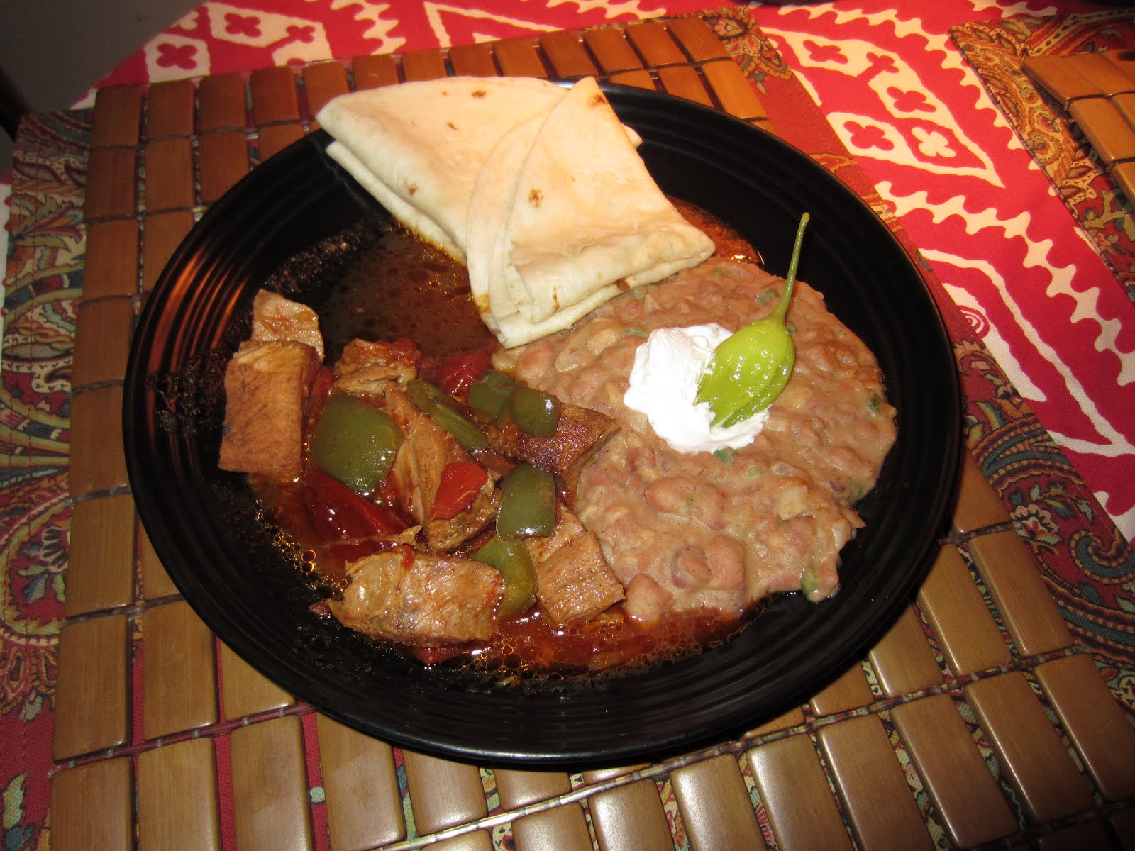 Since I refostered my love for refried pinto beans I realized that I should figure a lower fat version. So instead of a bacon drippings start, I just used a little sauteed onion and fresh jalapeno in EVOO and smashed the canned beans together with a touch of chicken stock. Afterwards I added a bit of mild cheddar and chopped pickled jalapenos and just about a tablespoon of sour cream for creaminess.