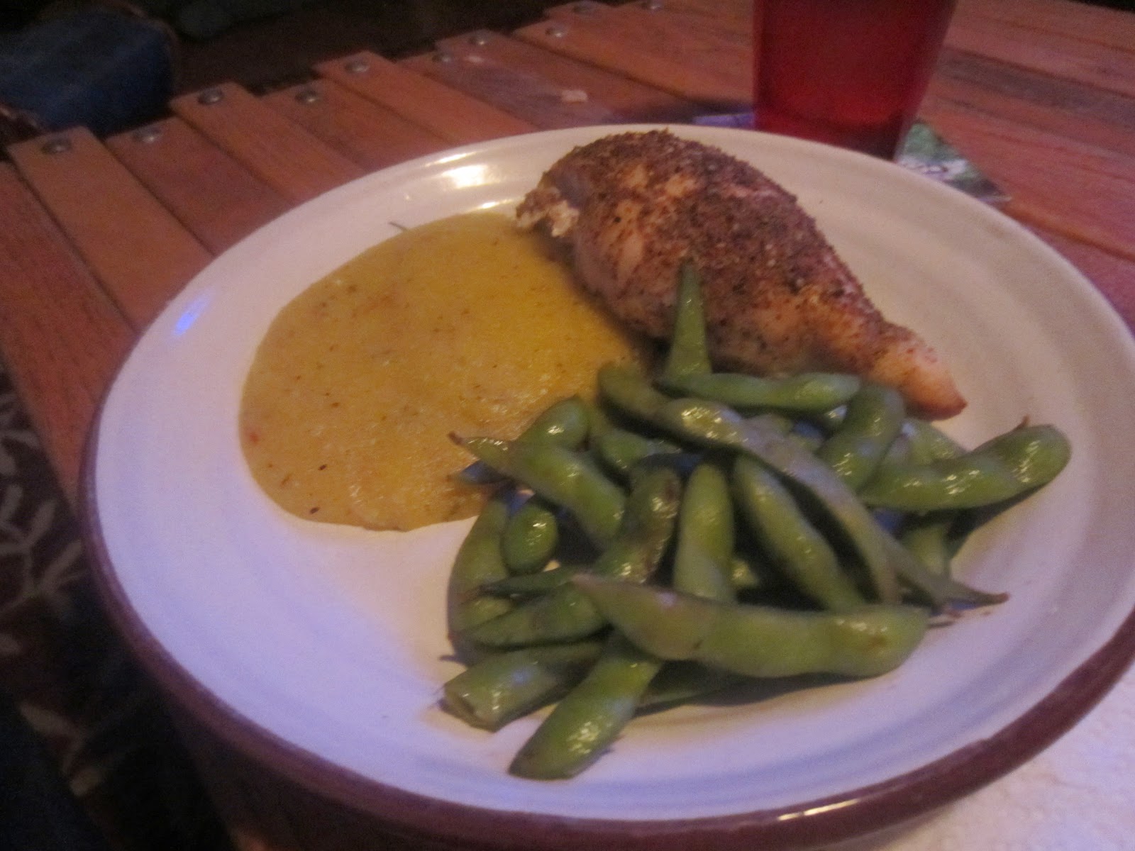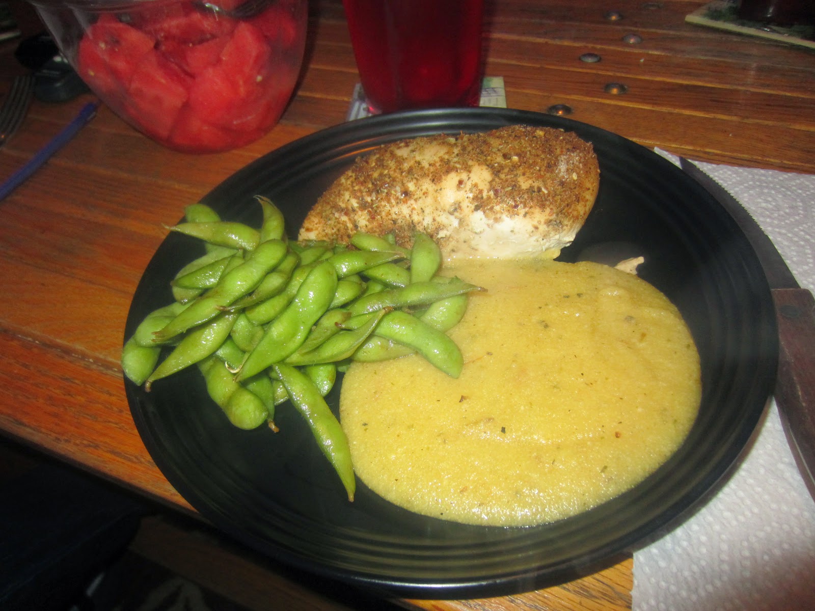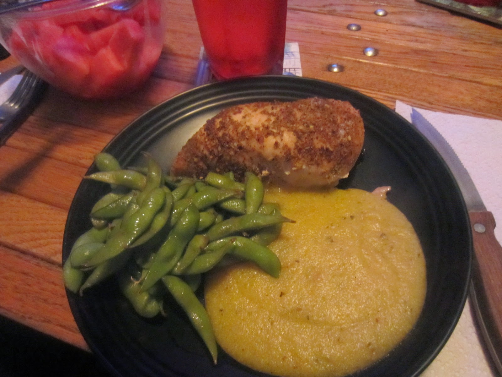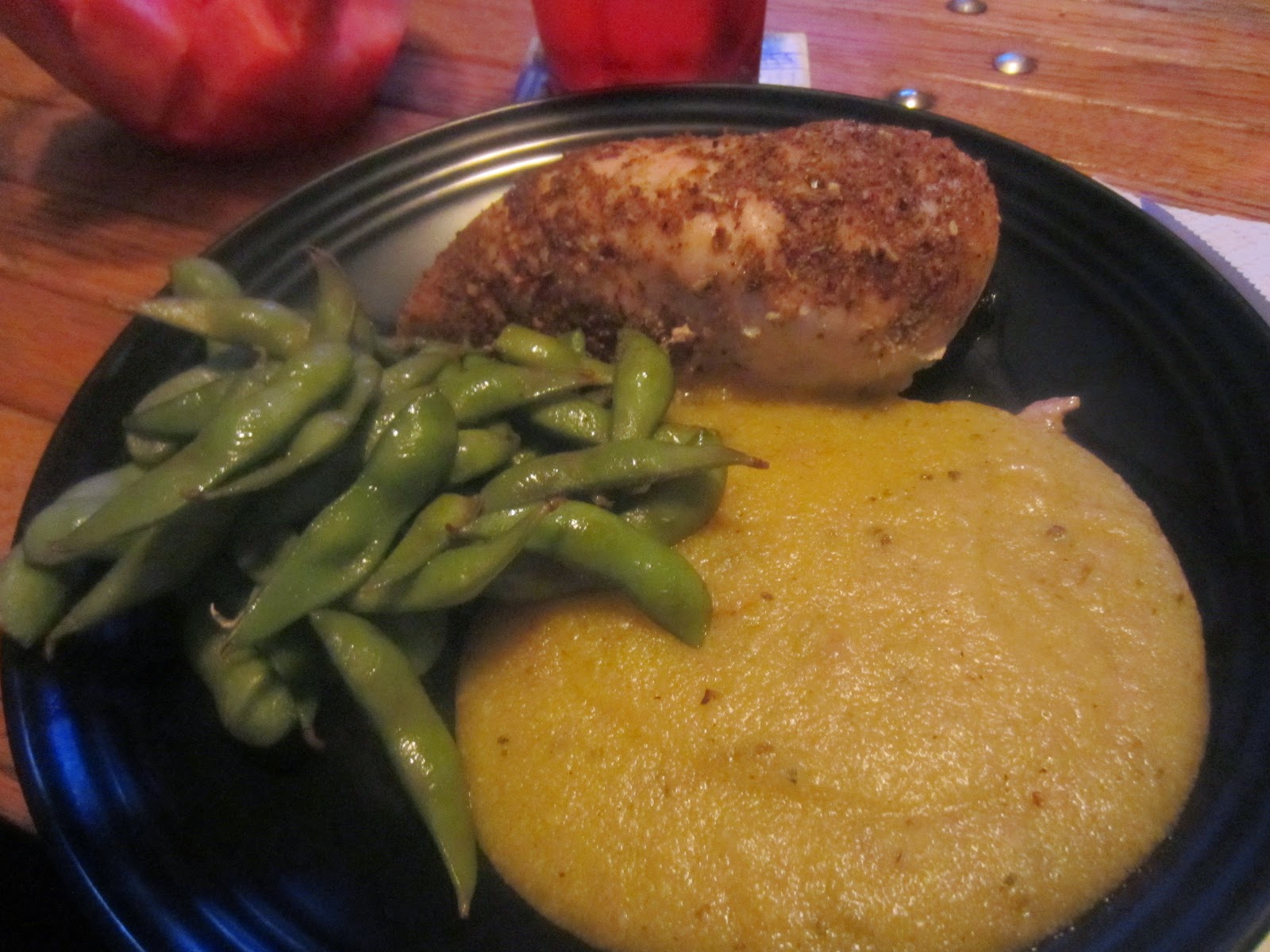 Using the last of my roasted chipotle salsa, I added a 1/2 cup to this corn meal mash with just chicken stock and a little olive oil. No butter, no cheese and it was still awesome!