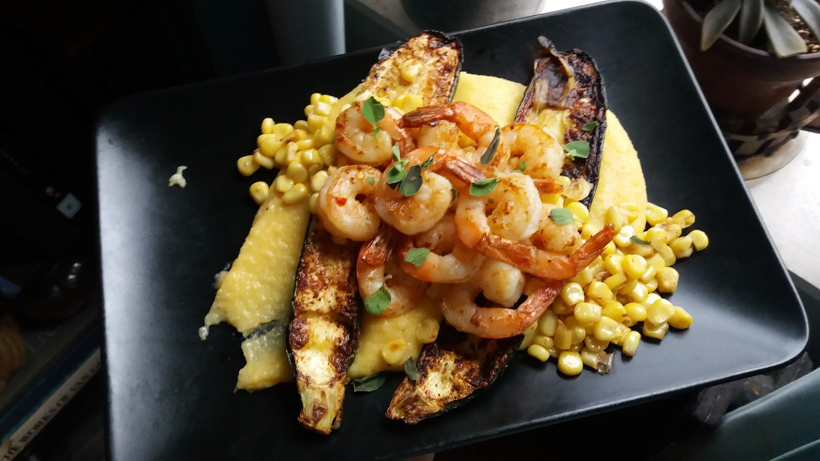 I love using those same senses to create interesting meals. I know zucchini and corn are a match made in heaven so roasted with shrimp and Parmesan Polenta with a touch of fresh pesto could be rustic and earthy, yet bright.