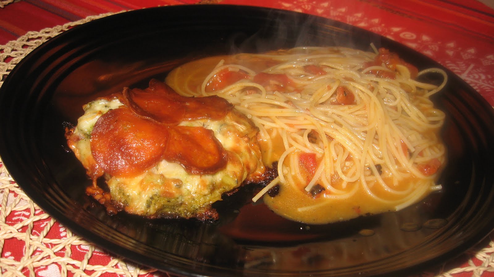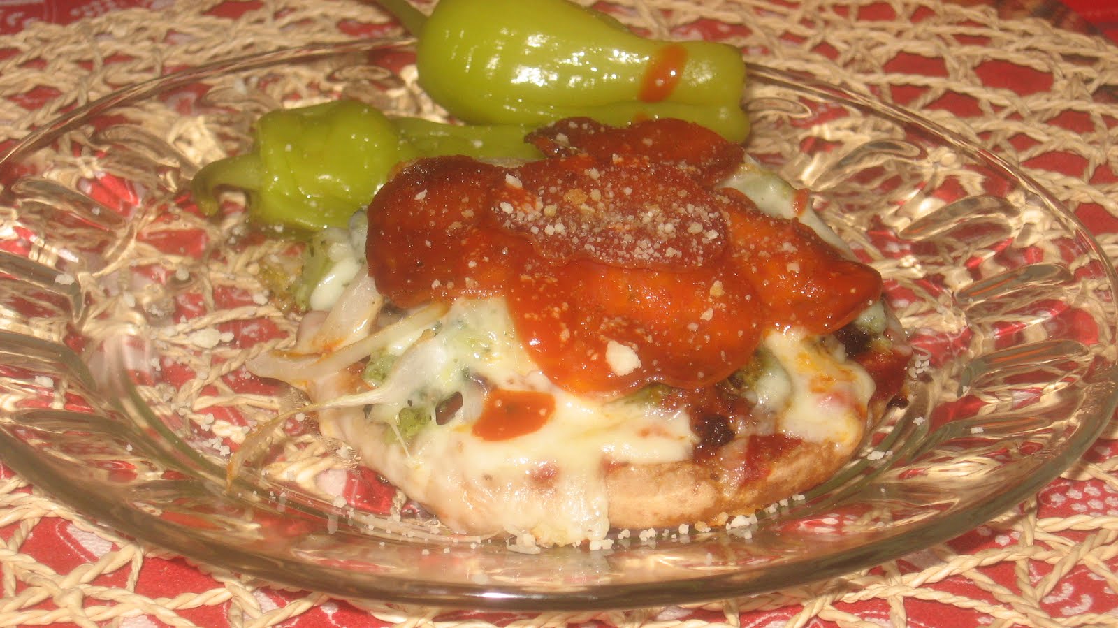 I'm trying to get back in the healthy swing of things after the holidays. Get inspired, create some fresh dishes. But the process has not been smooth. Little winter bugs, comfort cravings and general blahness have overcome will and desire. Still, mini pizzas on English muffins are always a treat. They look so good on that plate all that spicy sauce, pepperoni and cheese taunting me. Being a repeat offender, I had them again the next day for lunch with a side of wheat pasta and leftover tomato soup as the sauce.