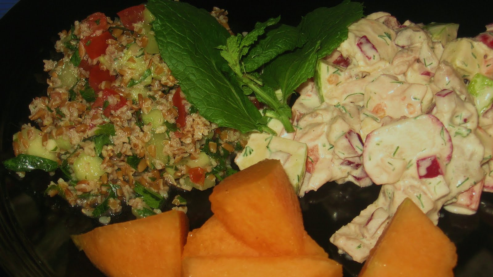 Then since I had all that mint, I attempted Tabbouleh with Bulgar wheat, tons of Italian parsley, mint, cold cucumber, tomato and lots of fresh lemon juice. This is invigorating and refreshing and I want to have it every day! Lemony goodness with this amazing grain that is not mushy or starchy. Bulgar even sounds strong. And would you get a load of that parsley! Four cups of parsley. Holding the dish down.... and succeeding.