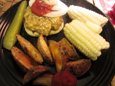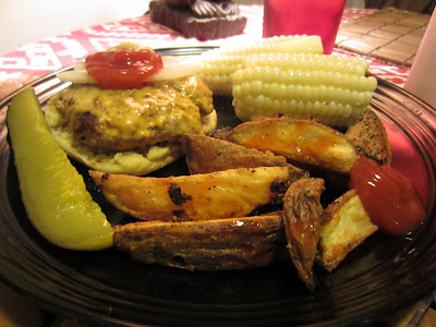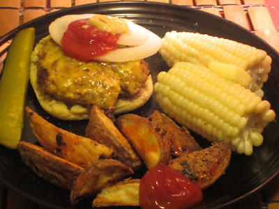 Juicy open-faced turkey cheeseburgers with baked garlicky fries. But the special guest was the first sweet corn of the season.