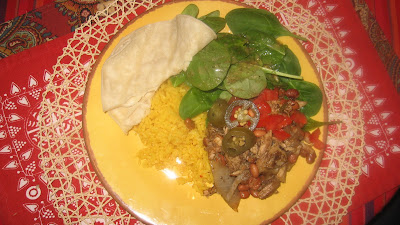 Spanish yellow rice accompanies cumin spiced shredded turkey, pinto beans and onions for 'put 'em together yo'self' soft corn tortilla tacos. A weeknight quickie, nice and easy. The best kind.