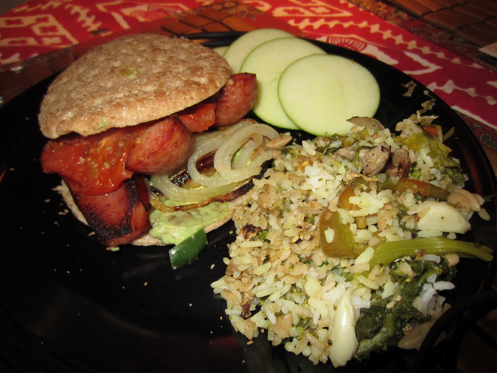 I've been infatuated with this new pizza stone and I've felt compelled to throw everything on it that I can think of. I'm having grill envy. Even here in Brooklyn some lucky tenants near us have grilling abilities. That smell is intoxicating. I'm happy for them. Sniff, sniff. So tonight I made turkey kielbasa sammies on my stone with big thick slices of roasted tomatoes and onions on thin sandwich bread with a slathering of smashed avocado and lime. Better than mustard!