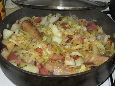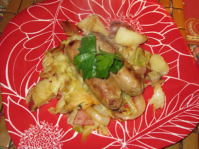 The answer is yes! In some ways, even better to have the flavor of the sweet braised cabbage mix with the sausage. To give it a little twang, what I did was to drain the potatoes then added some splashes of rice wine vinegar and lots of cracked pepper. After browning up the sausage and braising the cabbage, I put them all together in a hot pan with a bit of chicken stock. Let that heat through and meld for about 5 minutes.