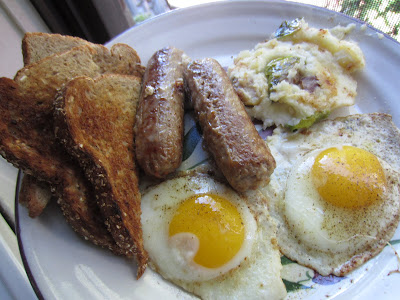 Last night I put in a small amount of effort and pre-seasoned and baked a nice big pork chop for P and wokked up some onions and yellow squash. For me, I wanted my stand-by spaghetti and meat sauce to lick my life wounds but I didn't have the right stuff. So I had to settle for creamy cheesy scrambled eggs with turkey sausage, onions and yellow squash to wrap in warm tortillas.