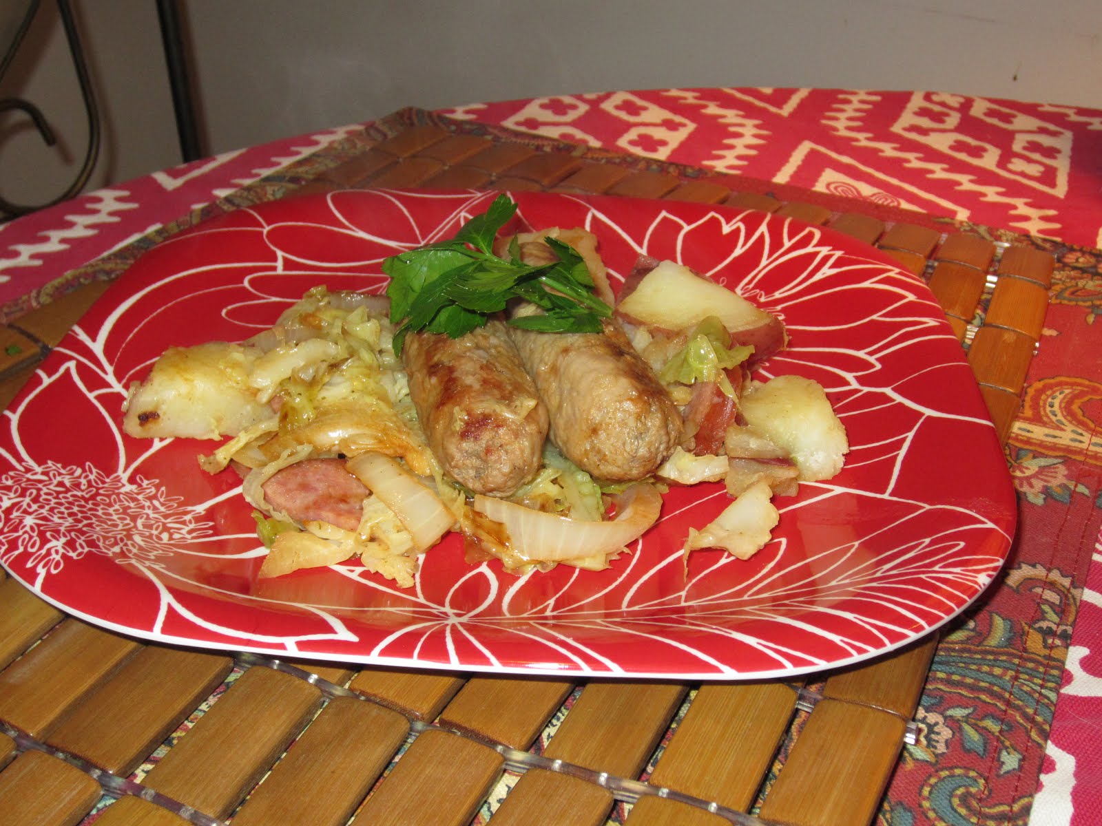 A big head of Savoy cabbage, turkey sausage and potatoes. Could fresh cabbage replace real Sour Kraut in this awesome threesome?